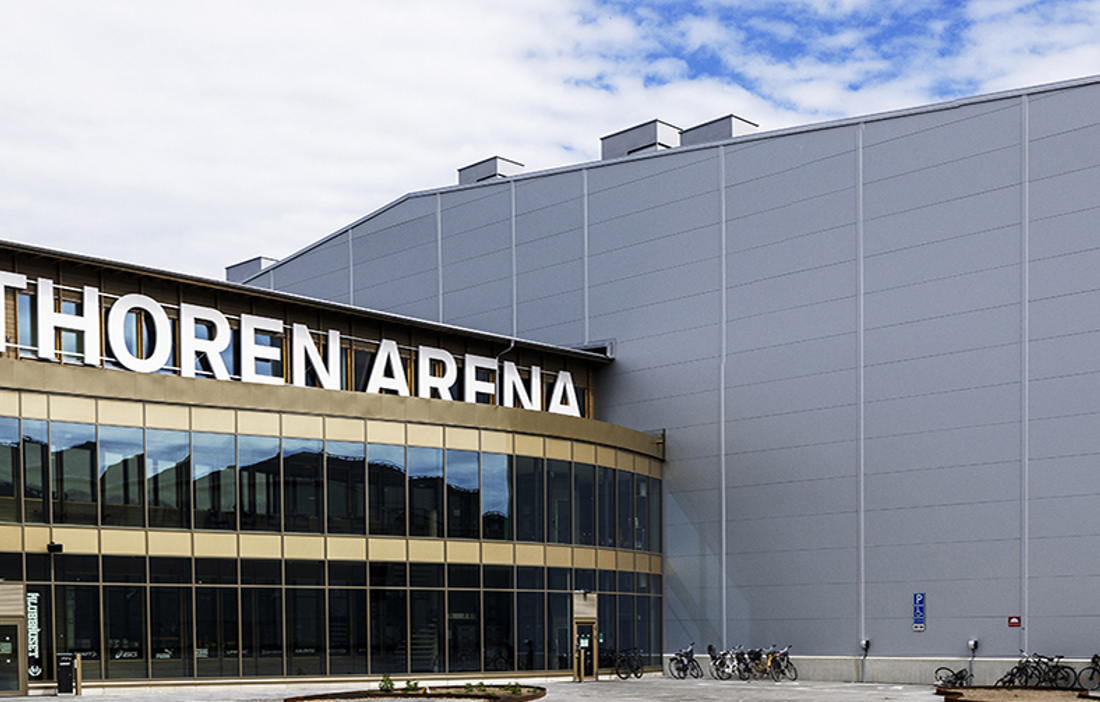 Denna multiarena är fyra våningar hög, med en totalyta på 16 500 kvadratmeter. De 19 takstolarna i limträ har en spännvidd på hela 67,8 meter och är bland de största som Martinsons monterat. |