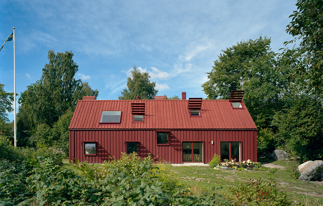 Som en välkommen lustifikation ligger denna villa i sin omgivning. Husets närmast arketypiska form, valet av trä i fasad och tak samt den faluröda färgen har en tydlig förankring i svensk byggnadstradition. Interiören överraskar med höga, tvärställda ljusschakt men saknar den konceptuella styrka som byggnadens yttre besitter. En otraditionell fönstersättning i såväl fasad som takfall, kaxiga ”solskydd” och obefintliga taksprång ger dock byggnaden ett självständigt och personligt uttryck.