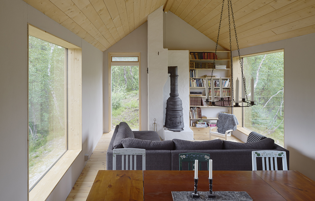 Finsågad vertikal granpanel, limfog av gran som fönstersmyg. Stomme och väggar av Isotimber och limträ av gran. Exteriört klätt med utvändiga panelbrädor av kärnfuru.