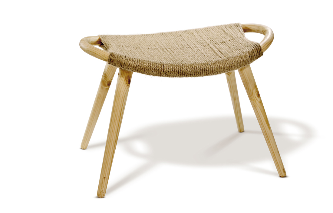 Det här är en pall för människor att sitta på och lugna ned sig efter intensiva storstadsarbetsdagar. Den är gjord av svensk furu med en tygklädd stoppning.