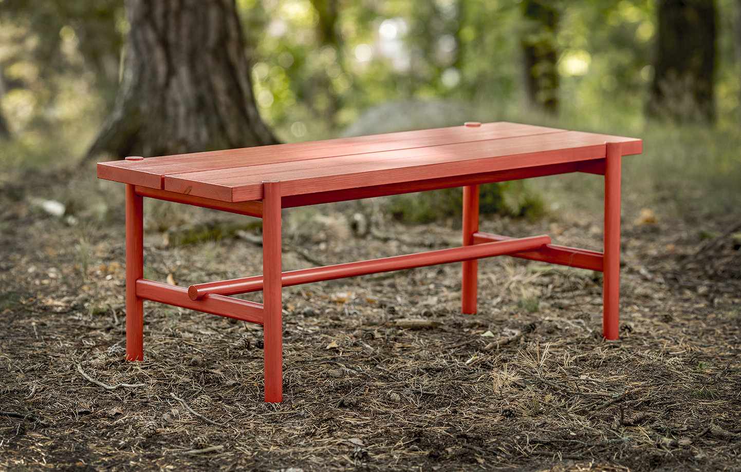 Ytbehandlingen i röd olja på furun användes för att utforska nya alternativ i träslagets estetik, för att ta sig an detta traditionella svenska material på ett innovativt och nutida sätt.
