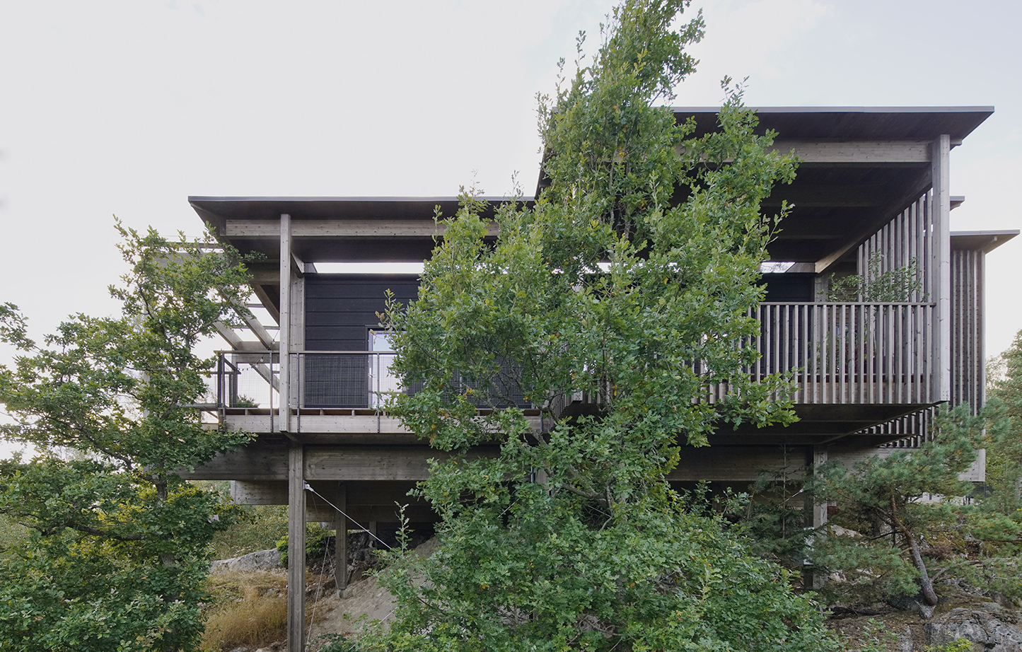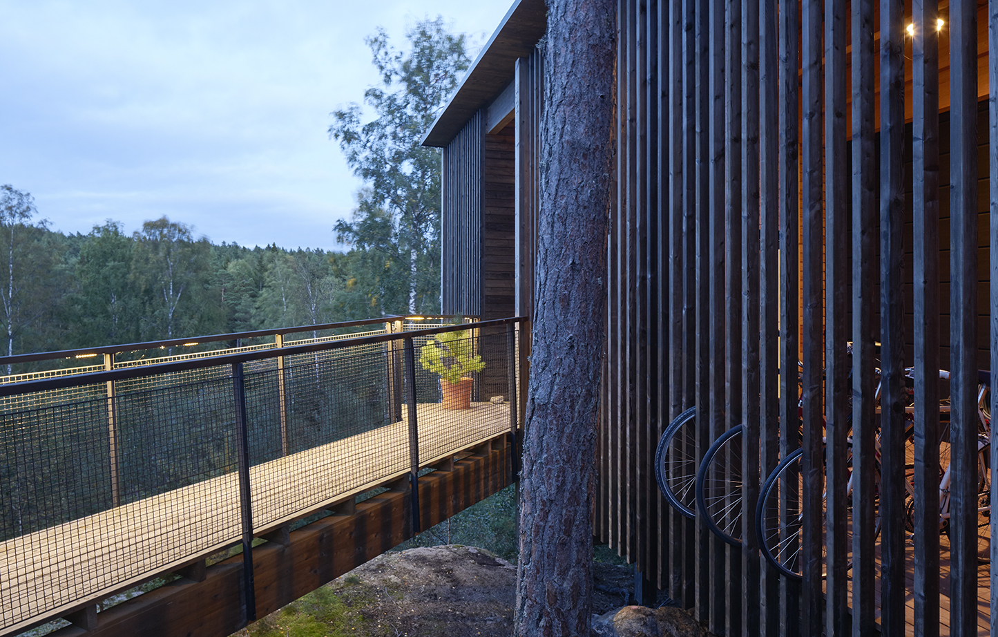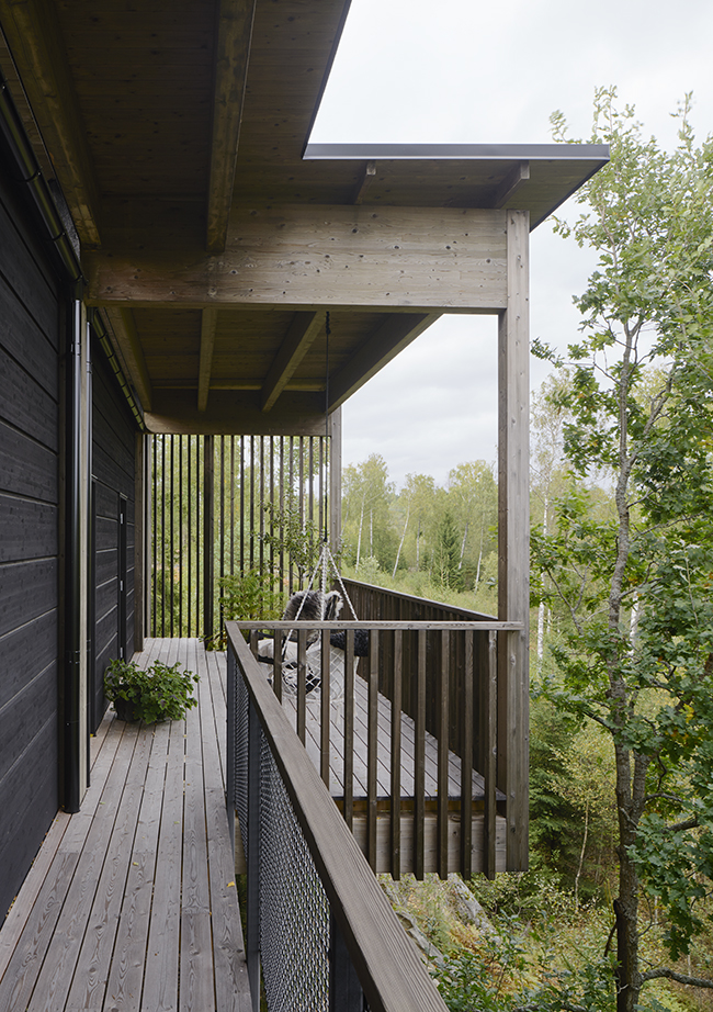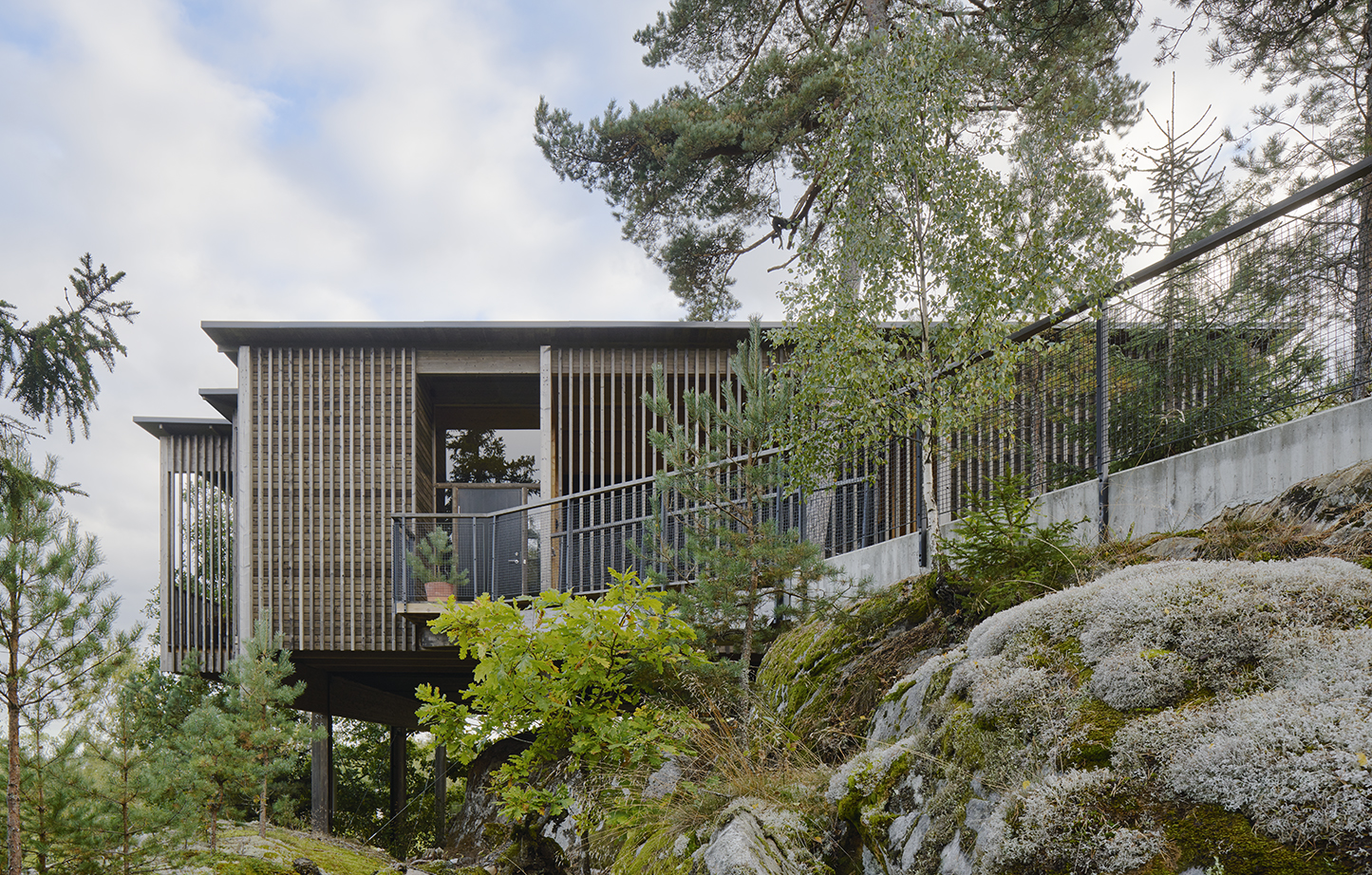 En byggnad med kvaliteter i flera dimensioner. Inplaceringen på den branta tomten är betagande och ger en känsla av att befinna sig uppe i trädtopparna, som i en koja där man kan spana ut över omgivningarna. Samtidigt lämnar den också den ståtliga ekbacken i stort sett intakt. Boendekvaliteterna är utöver de som normalt återfinns i villaproduktionen. En enkel plan som bjuder på mervärde i form av halv- och oklimatiserade rum för förvaring, verkstad, lek, torkning av tvätt, med mera. Välstuderade terrasser och utblickar över det vackra eklandskapet. Användningen av trä är habil och kontrollerad, de grova dimensionerna i den utanpåliggande stommen hanteras på ett elegant sätt. Detaljeringen är enkel och självklar och lyfter fram träets bästa egenskaper. Hållbarhetsdimensionen är i framkant med klimatskalet skilt från stommen och för uppvärmning används förnybar energi.