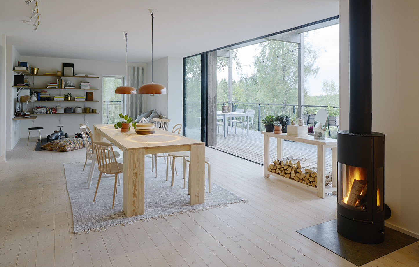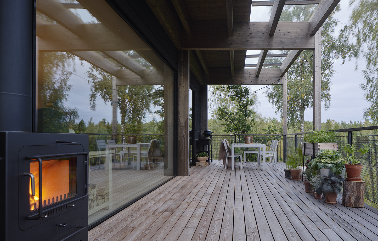 Emils Backe är en södervänd naturskön skogsbacke strax utanför Trosa tätort. Visionen för platsen är en modern ekoby som kombinerar de senaste tekniska land- vinningarna inom ekologiskt så väl som energisnålt byggande med traditionella beprövade material och tekniker. Fullt utbyggt kommer Emils Backe att bestå av 26 stycken villor, samtliga upplyfta från marken på träpelare för att maximalt bevara naturen på platsen. Livet levs bland trädkronorna och skogsbacken lämnas fri utan privatiserande inslag. Husen är uppbyggda kring en enkel välisolerad kärna som är densamma i samtliga byggnader. Kring basmodulen finns tillvalsvarianter på balkonger, terrasser, glasrum, kallförråd och även takterrass med sommarrum/gästutrymmen. I de mest dramatiskt kuperade lägena kommer även terrasser under husen att vara möjliga. De olika tillvalen täcker större delen av byggnaden och utgör därför det man primärt uppfattar som fasad vilket bäddar för en rik variation i uttryck och också individuell anpassning till de boendes intressen såväl som utsikt och insyn. De generösa yttre ouppvärmda ytorna avlastar funktionsmässigt den uppvärmda kärnan som därmed kan hållas väldigt kompakt utan att boendet upplevs som trångt. Hela den bärande stommen ligger synlig utanpå den isolerade basmodulen. Detta ger mycket av husens uttryck men är främst ett sätt att undvika köldbryggor. Vi har medvetet minimerat antalet glasade ytor men istället gjort de som finns rejält generösa. Huset har faktiskt inga fönster utan bara glasade ytterdörrar. Mot söderterrassen vetter två skjutdörrar som fullt öppnade ger nästan sex meter fri öppning mot kök och allrum innanför, allt för att knyta livet inomhus till trädtopparna utanför.