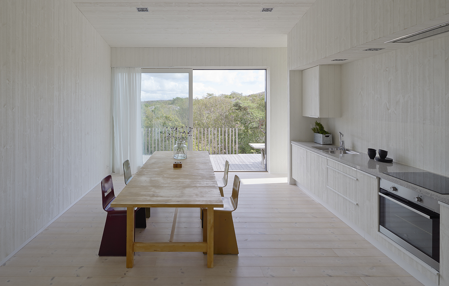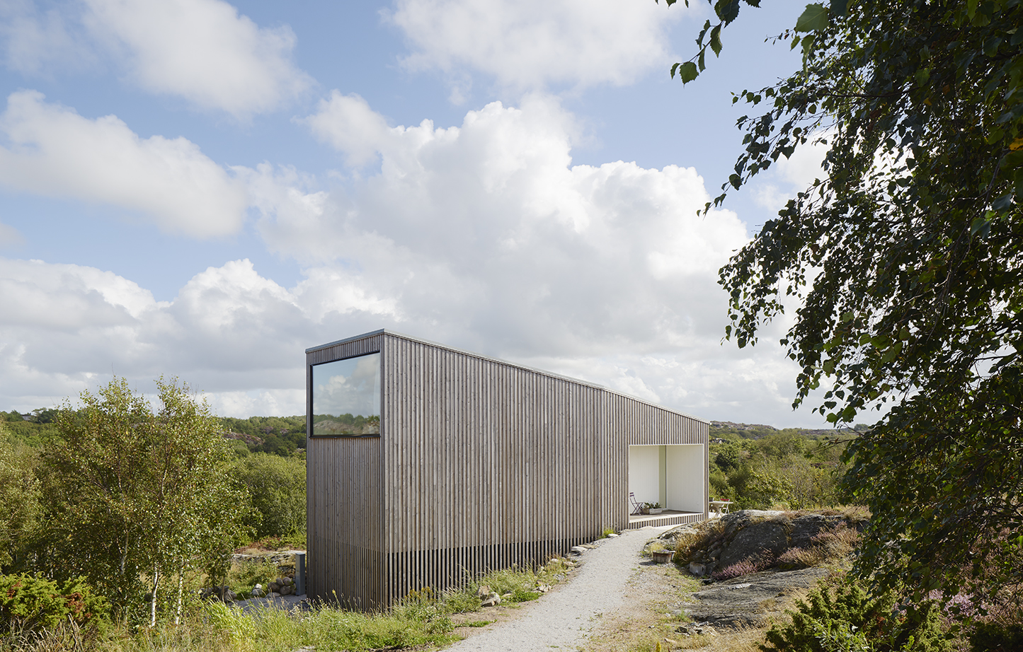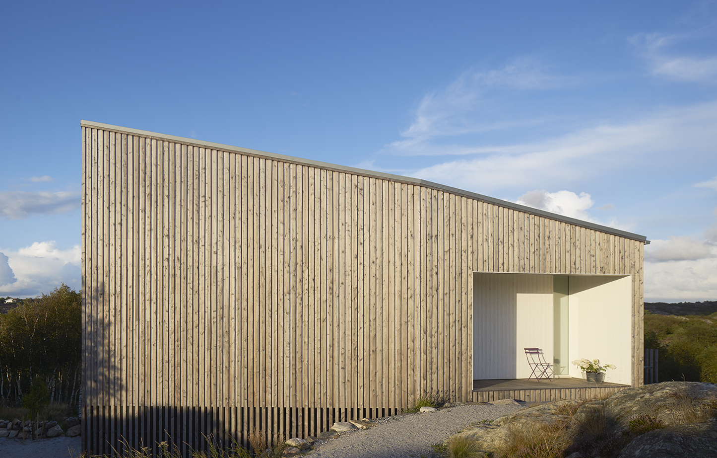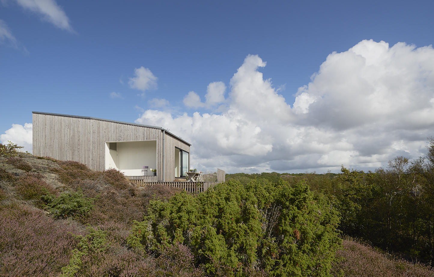 En lågmäld men mycket karaktärsfull volym som annonserar sig med det stora fönstret och entréloggian. Varsamt placerad på de västkustska knallebergen, mötandes mark på ett självklart sätt och sträckandes efter den åtråvärda havsutsikten i väster. Gästhuset välplacerat som visuell buffert mot grannar. Hushållning med uttryck, volym och material. Trappan, sisalbelagd, blir läktare och leder upp till »altaret«, utsiktsfönstret och ett rum som inbjuder och uppmuntrar till samtal kring den öppna spisen. Rörelsen från den lilla grusvägen nedför slänten, in i huset, uppför trappan till det övre rummets klimax är avslappnat och effektivt regisserad. Fabriksmålad, sågad panel invändigt överraskar positivt. Sammantaget stor arkitektur i litet format där träet spelar en viktig roll.