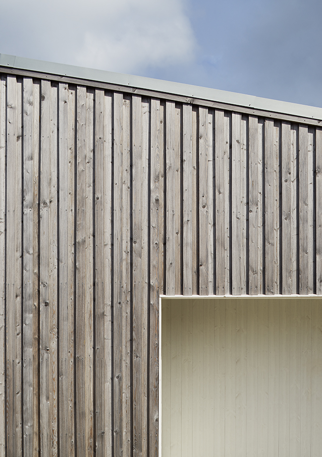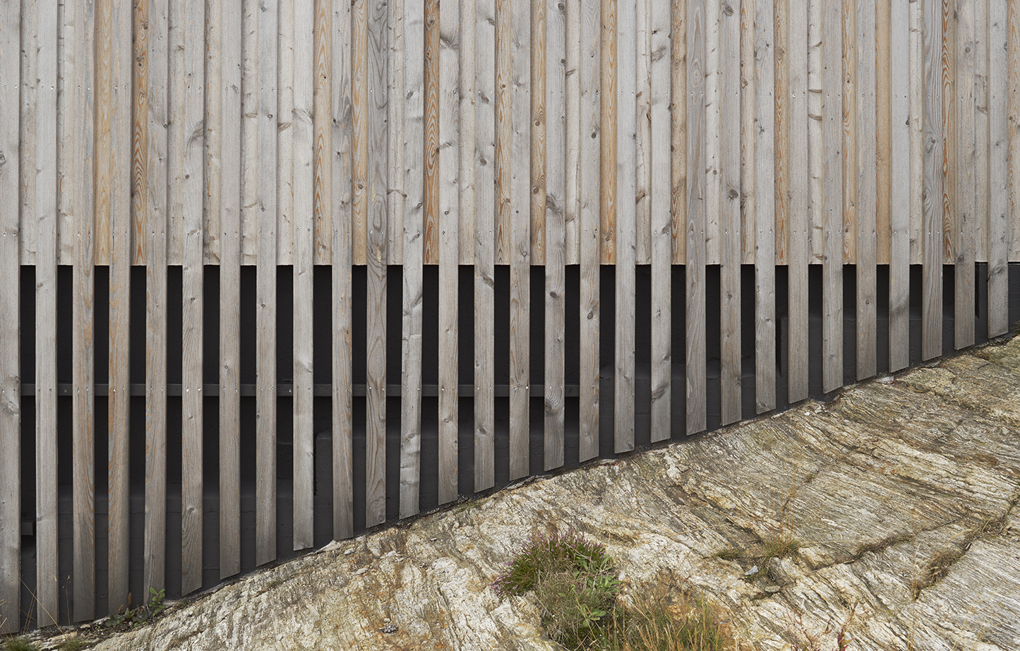 Beställarens intresse för trä innebär att det är konsekvent använt, som konstruktionsvirke, fasad och invändiga ytskikt. Trä har en oslagbar potential i dess möjlighet att bearbetas på plats, vilket byggnadernas möte med marken visar. Fasadens lock löper förbi sockeln och är försiktigt avsågade precis ovanför bergsknallarna. Byggnaderna reagerar på bergens minsta skiftning och fullföljer samtalet om platsen.