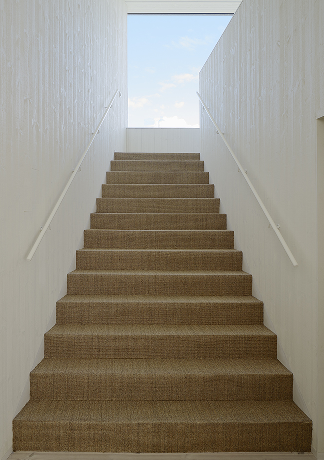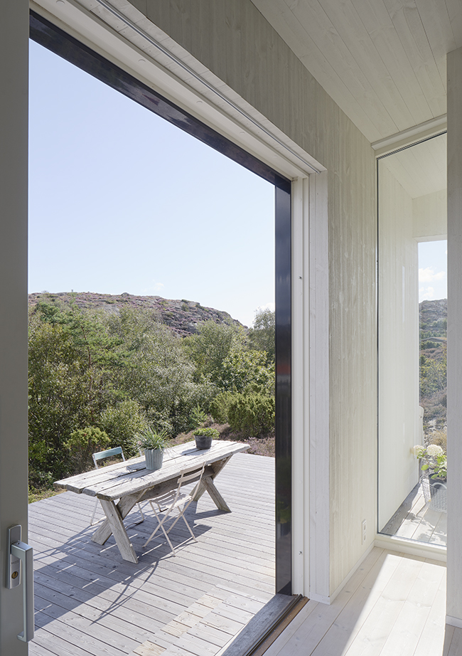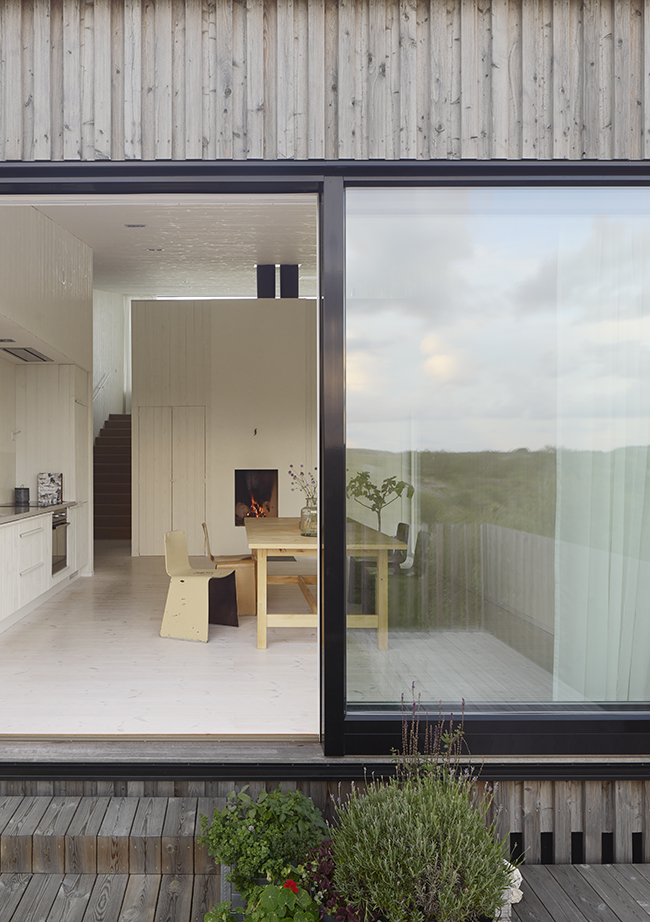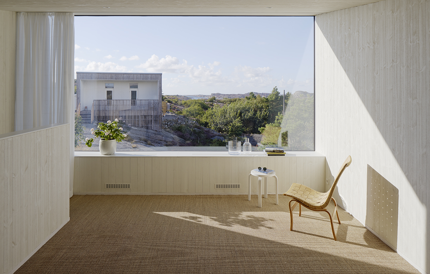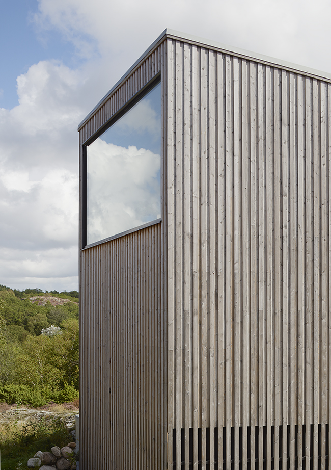 Två byggnader bildar ett par med noggrant avvägda lägen. Tomten ligger högt men inte tillräckligt för att se sundet från marknivå. Terrängen och önskemål att se havet avgör huvudbyggnadens sektion, med översta våningen anpassad till en höjd för att ge utblick mot sundet. En mindre komplementbyggnad skyddar mot insyn grannarna emellan och definierar tomtgränsen. Rummet mellan byggnaderna tas i besittning.
