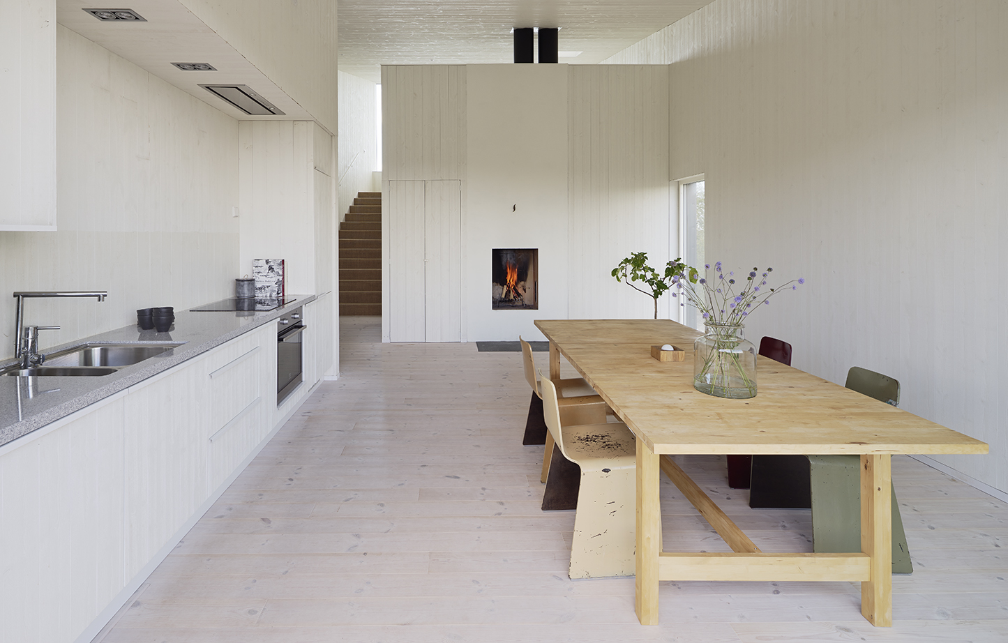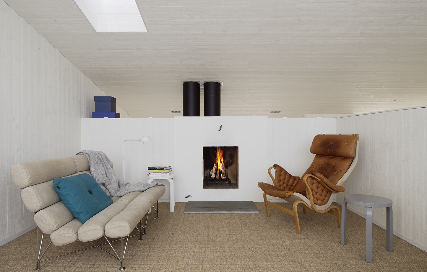 Programmet är alltså delat i två, det stora huset innehåller kök, vardagsrum, sovrum och bad, och det mindre två sovrum för gäster. Planlösningen i huvudbyggnaden baseras på att man samlas kring eldstad och utsikt, en närmast primitiv plan. Murstocken står i byggnadens centrum med två eldstäder ovanpå varandra. Vardagsrummet med den övre eldstaden i ena kortsidan och utsikt i andra, köket med den undre och utsikt i motsatt riktning mot söder. Fönsteröppningarna ger endast utblickar mot orörd natur och allmän plats.