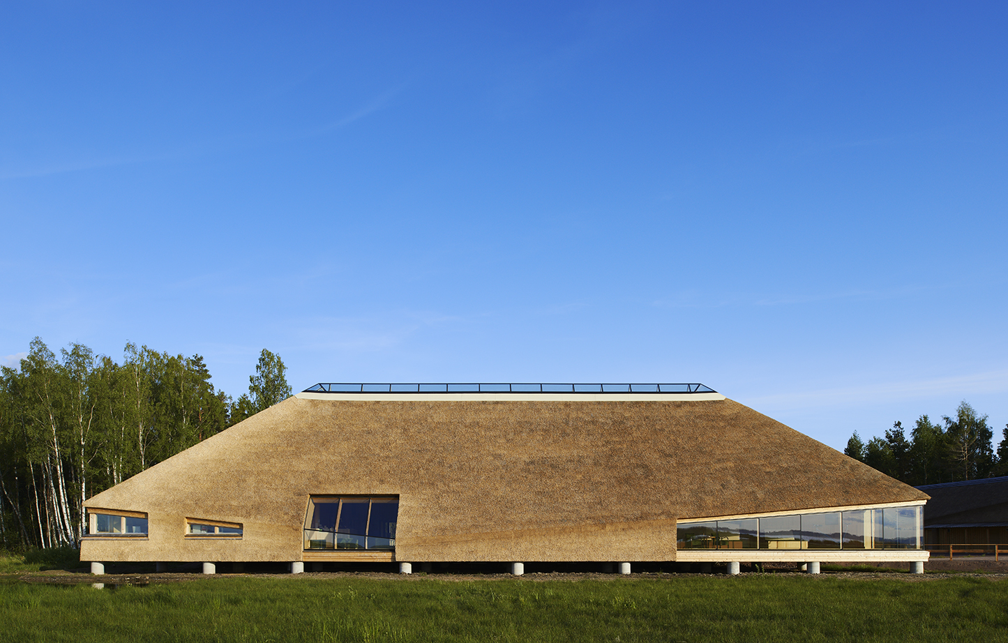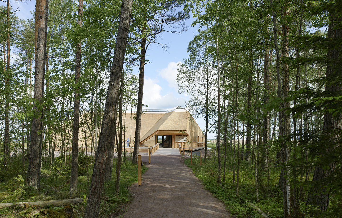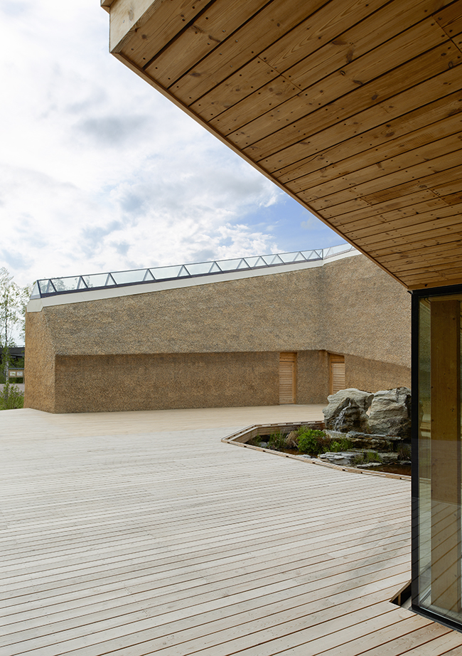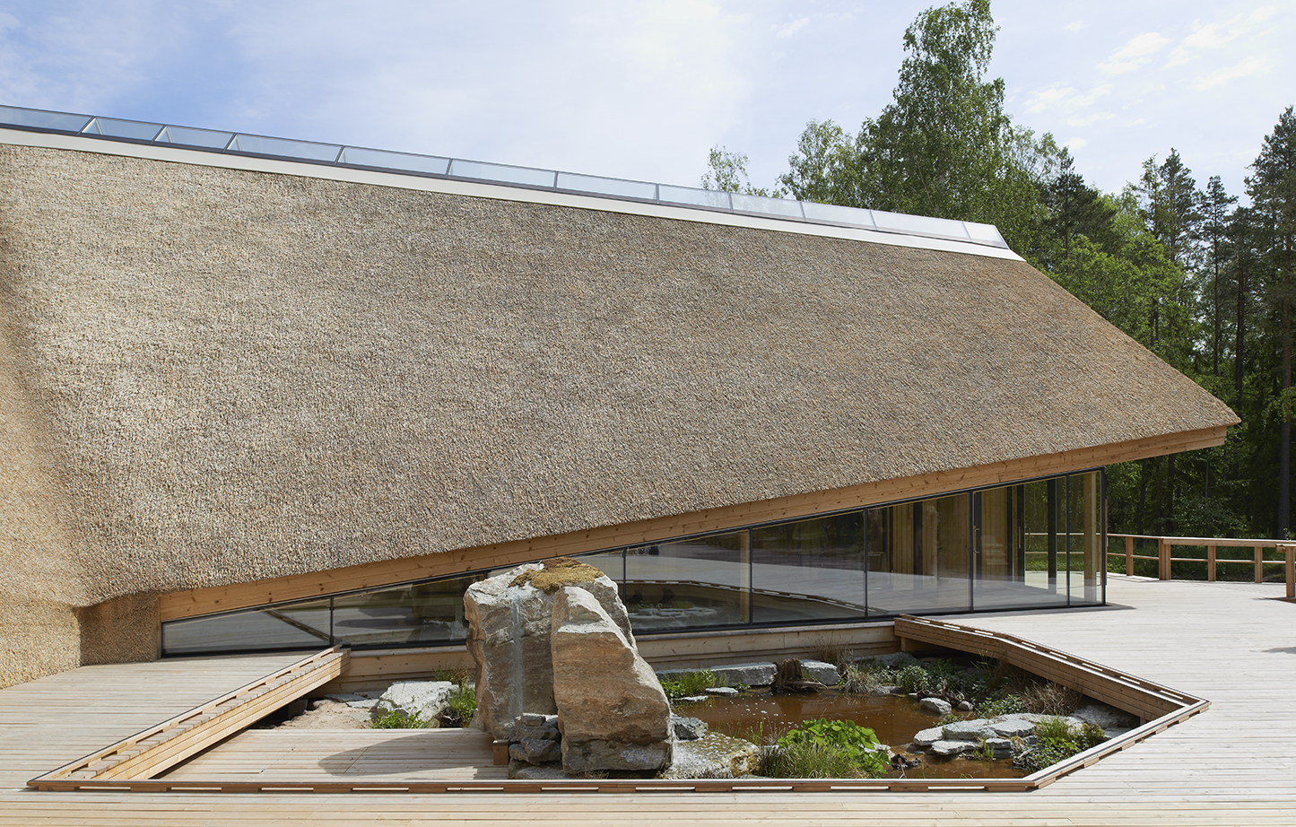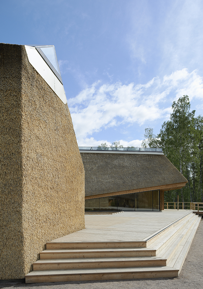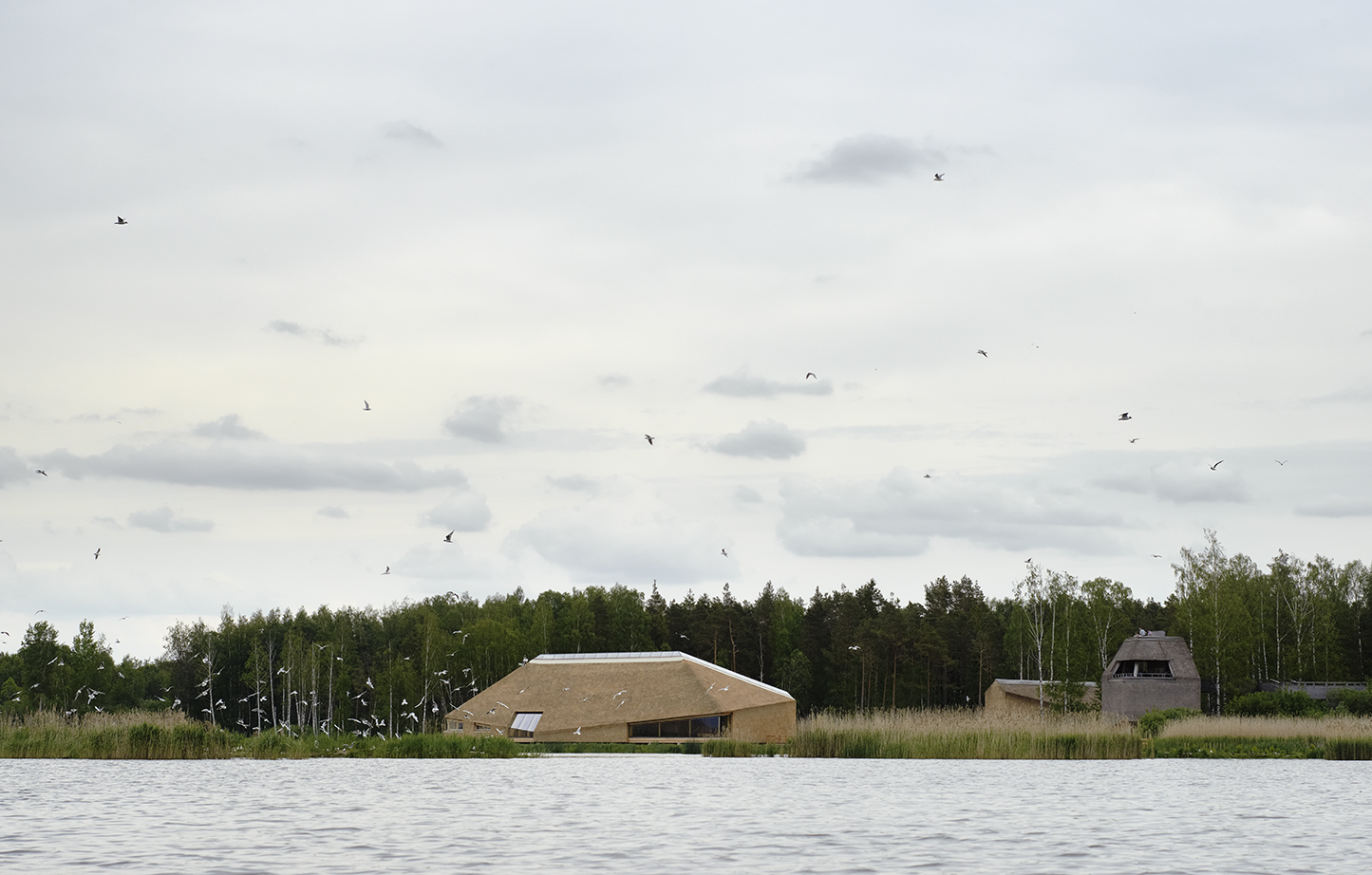 När vi kom hem satt minnet av vädret, vassen och det lilla lyftet starkast kvar. Vi ritade en skyddande U-form, öppen mot södersolen men sluten mot sjön och arktiska vindar. En plats att samlas på och kanske ta en fika. En ny gångstig leder rakt mot entrén och en träramp lyfter besökarens ögon upp över den vajande vassen. Den första utblicken över sjön serveras besökaren när han stigit in, dragit av sig stövlarna och i tofflor hasat in på trägolvet. Planen kom fort, sektionen lite senare.
