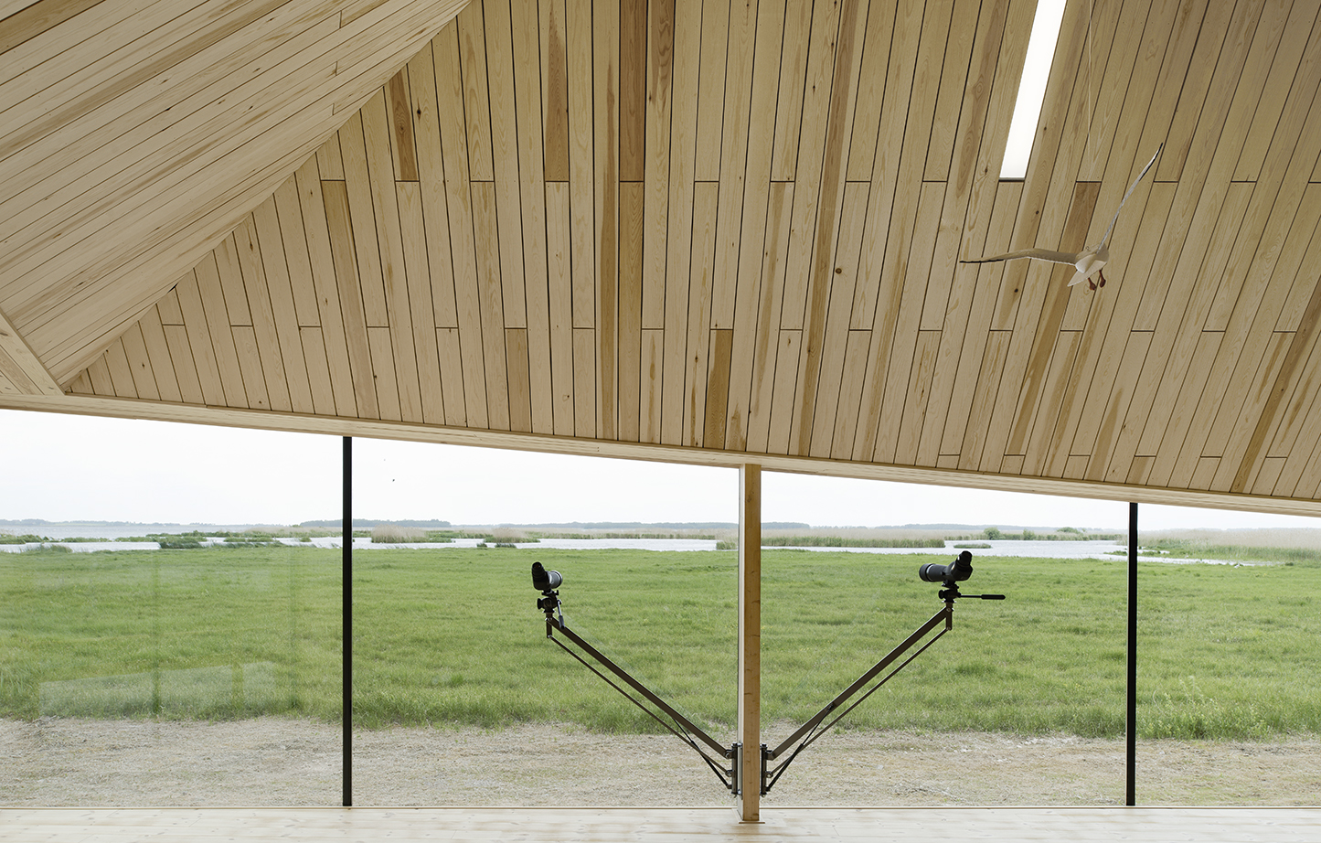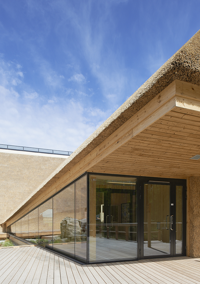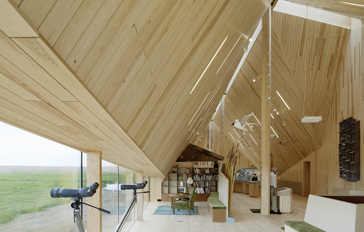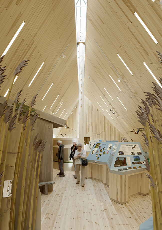 Den höga volymen passade bra för att hänga upp utställningens många fåglar i. Vassrörets sårbarhet gav en detalj där klart glas i taknocken skyddar det mest utsatta samtidigt som utställningsrummet får måttligt med dagsljus. Vi byggde en ganska stor uppsättning modeller innan mötet mellan den fria planen och den höga sektionen »satt«. Det blev en skarpt skuren vassmassa. En smygare (stealth).