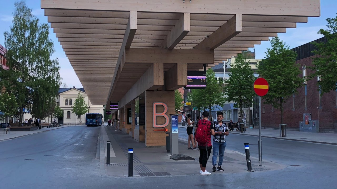 ”Under de stora träbjälkarna finner resenärerna både skydd mot väder och vind, samt möjlighet till en stunds vila och eftertanke. De två stora taken täcker tillsammans en 160 meter lång och 10 meter bred yta”, skriver Wingårdh på sin hemsida. Här ser vi Vasaplan i Umeå av Wingårdh Arkitektkontor AB.