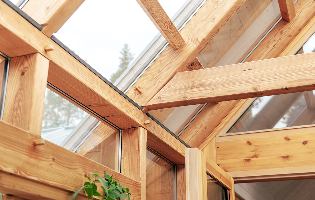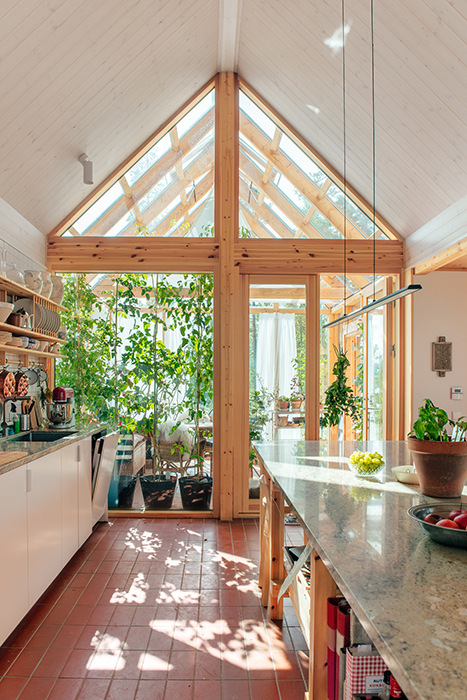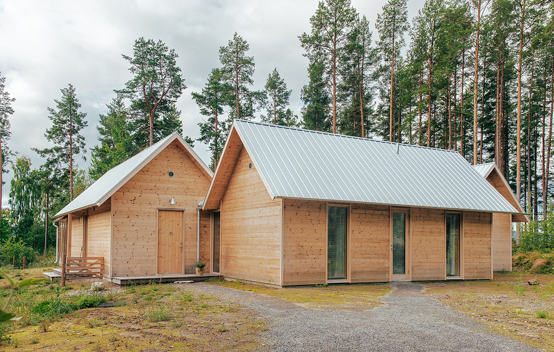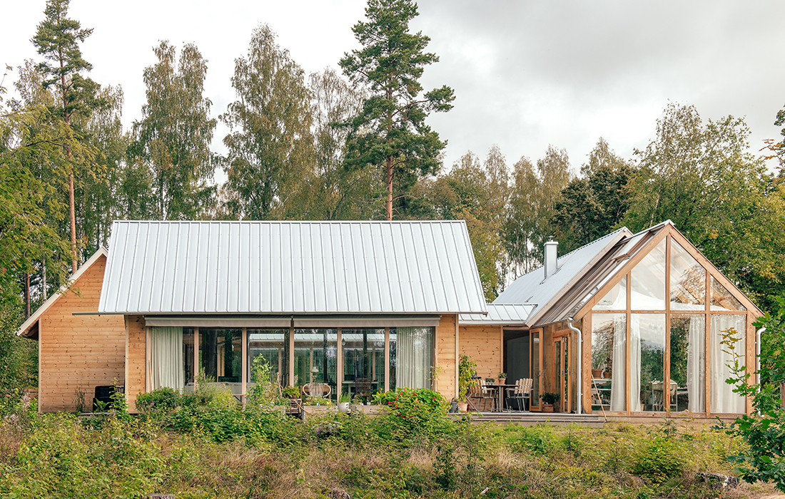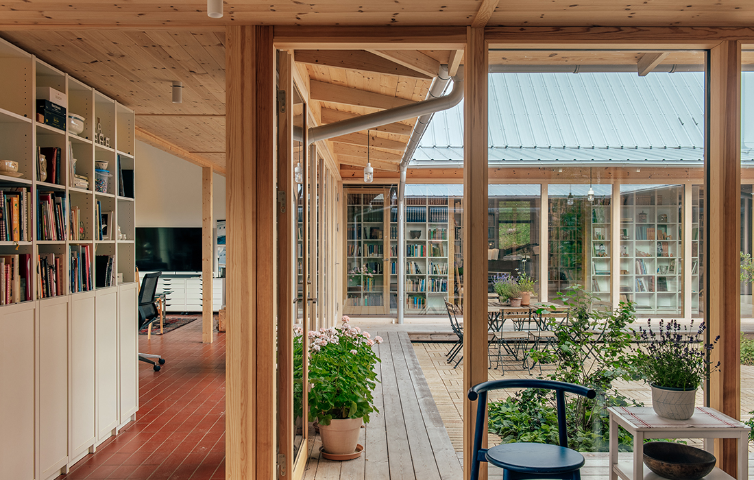 Hälsingland. Arvet från traktens världsarvsklassade gårdar uppdateras i denna ”fyrgård” där fyra resliga sadeltakslängor – var och en med sin specifika funktion: kök, ateljé, musikrum, boende – bildar ett läigt tun (innergård). Byggnaden har fått sitt namn från den biblioteksgång som länkar de fyra delarna, en uppglasad passage närmast tunet som med sina rytmiskt ställda träkarmar för tankarna till en pelararkad kring en klassisk klosterträdgård. Uråldriga referenser, här parade med vår tids datateknik – särskilt takets millimeterprecisa origamistruktur utgör en spännande kontrast till fasadens obehandlade kärnfuru.