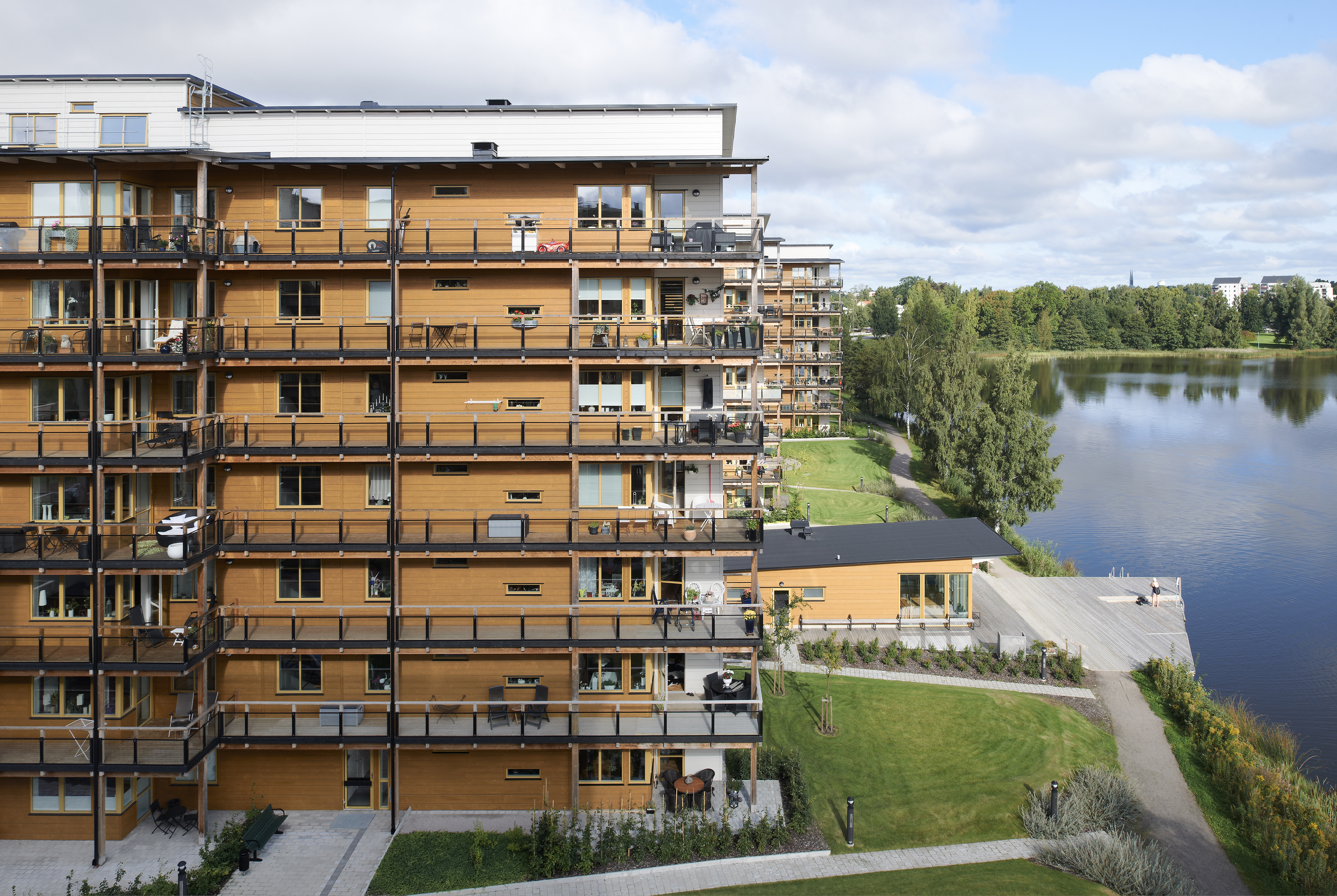 Varför bygger man åttavånings bostadshus i trä? En förklaring, tillsammans med alla andra, får man när man kommer in i husen i kvarteret Limnologen, vackert belägna vid sjön Trummen i Växjö. Här finns träkänslan. Den finns i doften, i tystnaden, i luften, i helheten. De fyra husen är helt byggda i trä: stomme, bjälklag, väggar och även hisschakten. Den understa våningen är dock djuten i betong för att ge husen tillräcklig stabilitet. Kvarteret Limnologen utgör ett lysande exempel på hur man kan bygga stort och spännande i trä.