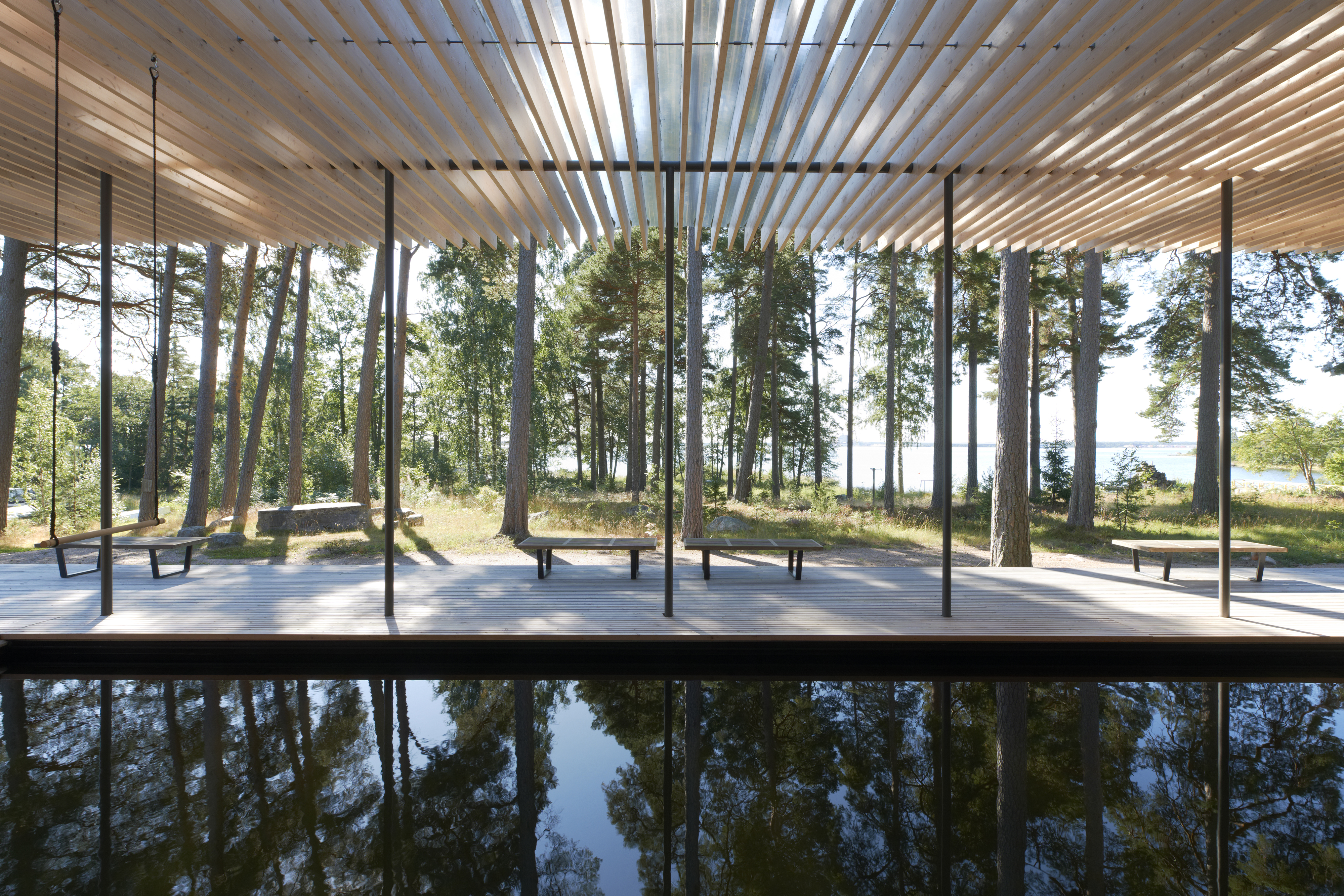 Den smala paviljongen på halvön Norrlandet utanför Gävle bjuder på en upplevelse som hämtat sin näring från skogskojor och nordiska timmerhus, 1970-talets gillestugor, men framförallt från själva platsen och den sekelgamla helhetsmiljön. Byggnaden skapar ett arkitektoniskt gestaltat skogsbryn där massivträstrukturen står lätt i skogsmarken på platsgjutna betongplintar. Massivträskivorna bilder också scenografi för badupplevelsen där man på ett trädäck av kärnfuru rör sig fritt mellan ute och inne mot skogen och havet.