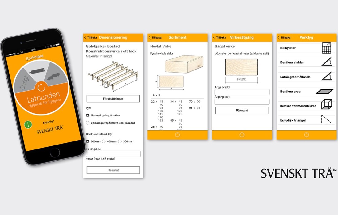Med hjälp av appen kan man på ögonblicket få smidig hjälp med vilka dimensioner som krävs för altan-, golv- och takbjälkar samt takstolar i olika situationer. Den innehåller också ett beräkningsverktyg för virkesåtgång när det gäller spontat virke, lockpaneler och reglar samt information om virkesdimensioner och träskyddsklasser. Appen är en gratis och digital variant av publikationen med samma namn, som är en av Svenskt Träs mest populära publikationer.