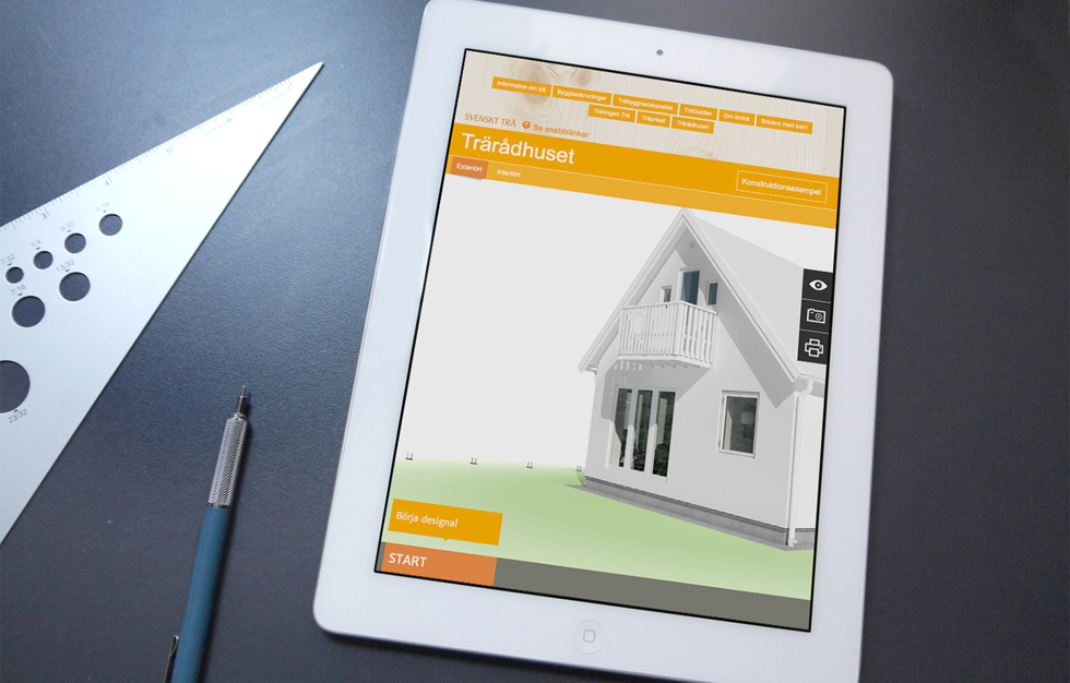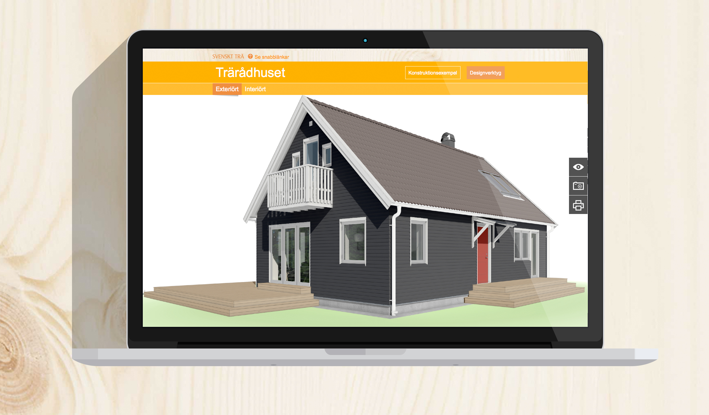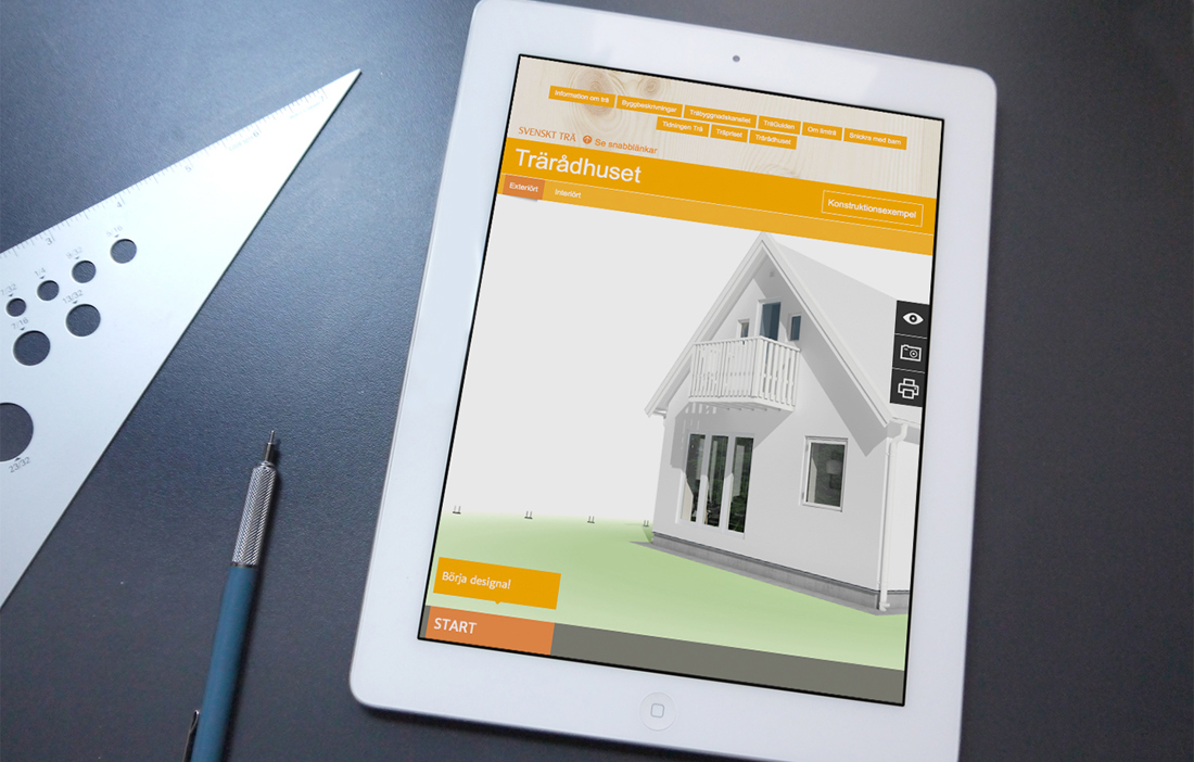 För att inspirera till att använda ett miljövänligt material invändigt har Svenskt Trä även tagit fram ett interiört designverktyg där användaren själv kan välja olika invändiga paneltyper enligt svensk standard. Panelen kan monteras stående, liggande eller som bröstpanel både liggande eller stående. I designverktyget kan användaren även välja olika typer av trägolv och invändiga paneltyper till taket. När användaren gjort dessa val är det dags att komplettera med golvsocklar, taklister och foder. För att få ytterligare inspiration och för att få se en helhetslösning finns det olika möbleringsalternativ.