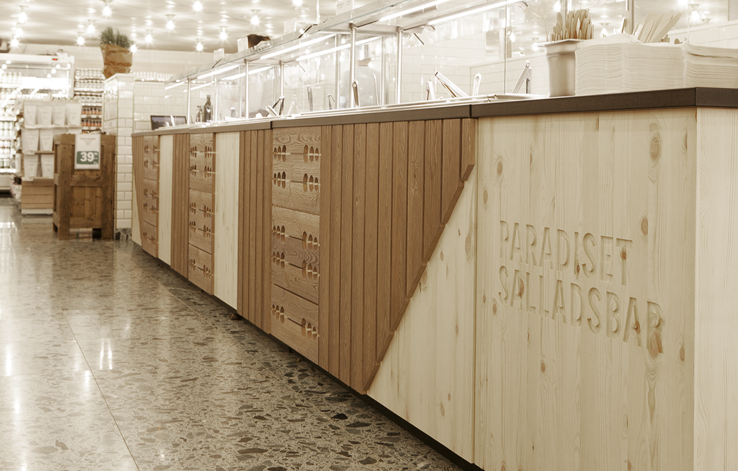 När branschorganisationen Svenskt Trä samarbetar med matbutiken Paradiset inför nyöppningen av butiken på NK skapas en butiksupplevelse med innovativt framtidstänkt där hälsa och hållbarhet står i fokus. Genom att använda furu från svenska skogar i inredningen får varumärket den inramning som man strävar efter.
