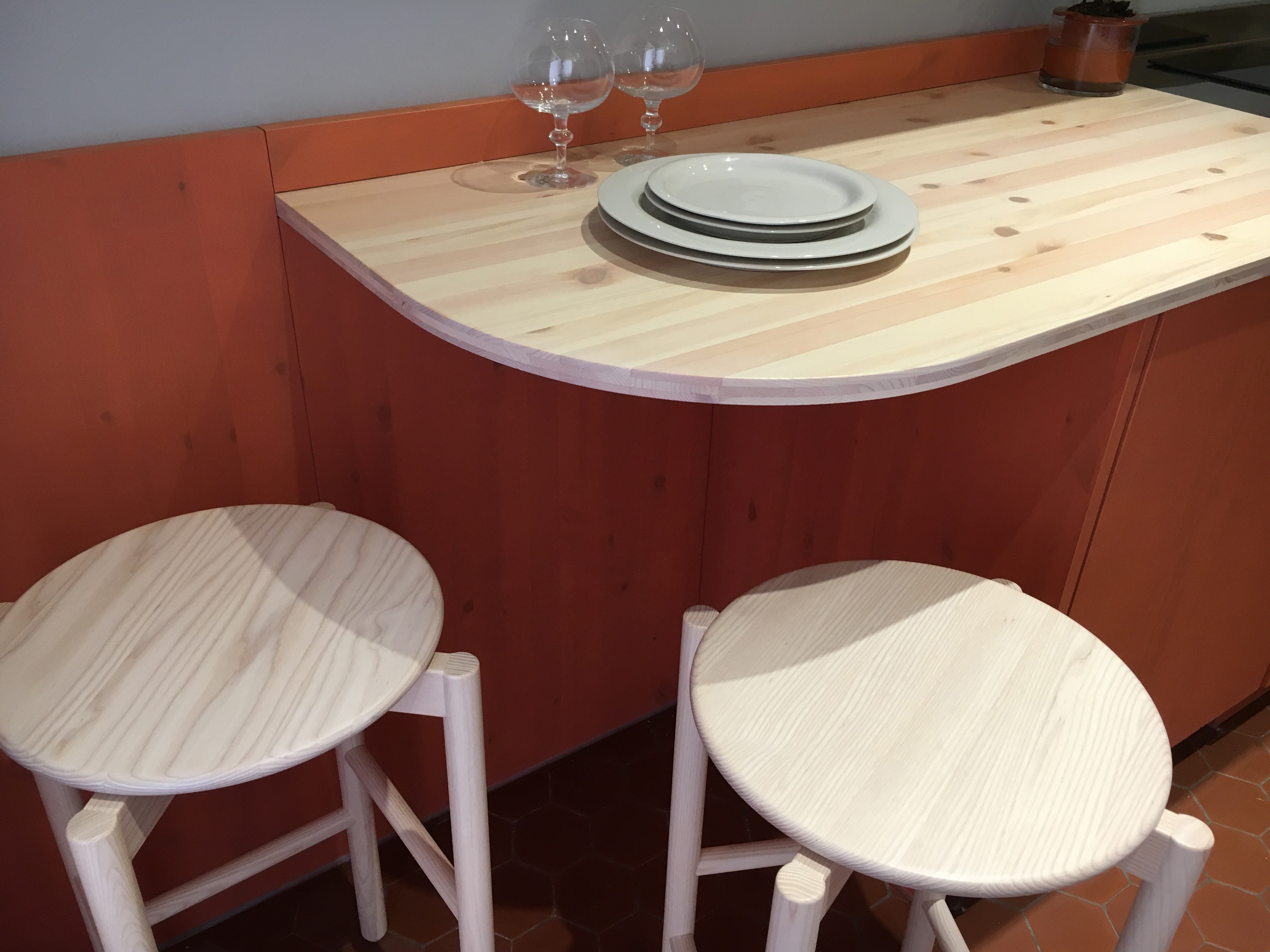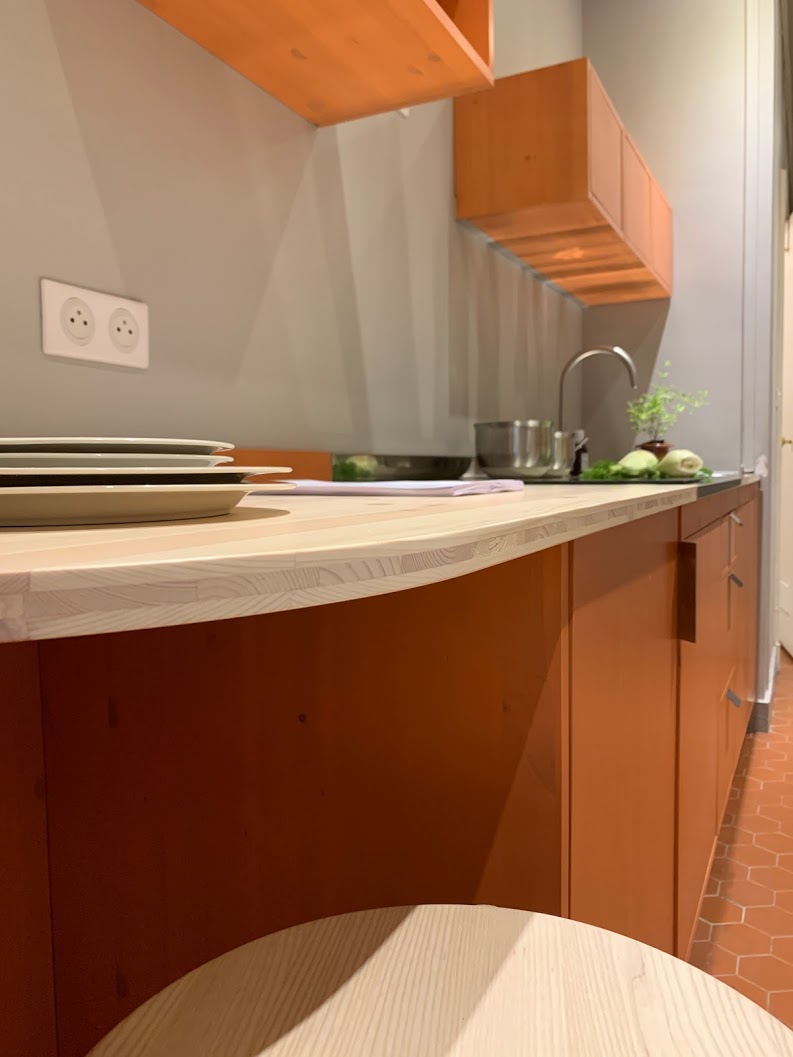 Designerduon från Beckmans fick i uppgift av Svenska institutet att skapa ett naturnära rum av korridorsköket som inte riktigt gick ihop med resten av huset som är fyllt av historia, konst och liv. Med inspiration från kvinnliga konstnärer som tidigare satt sina spår i lägenheterna hos Svenska institutet i Paris, skapade de ett både estetiskt vackert och praktiskt kök. Den rundade bänkskivan bjuder nu in till samtal med den som lagar maten och kan även fungera som arbetsbord en tidig morgon.