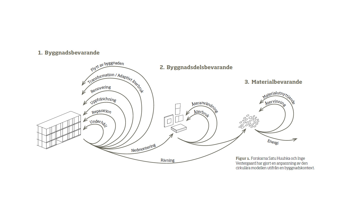 Att låta byggnader stå över tid representeras av de innersta cirklarna i teknosfären i modellen över den cirkulära ekonomin. Forskarna Satu Huuhka och Inge Vestergaard har gjort en anpassning av modellen utifrån en byggnadskontext, (figur 1). Den tydliggör på ett annat sätt att de grönaste – eller mest cirkulära – husen är de som redan är byggda och som underhålls och vårdas.