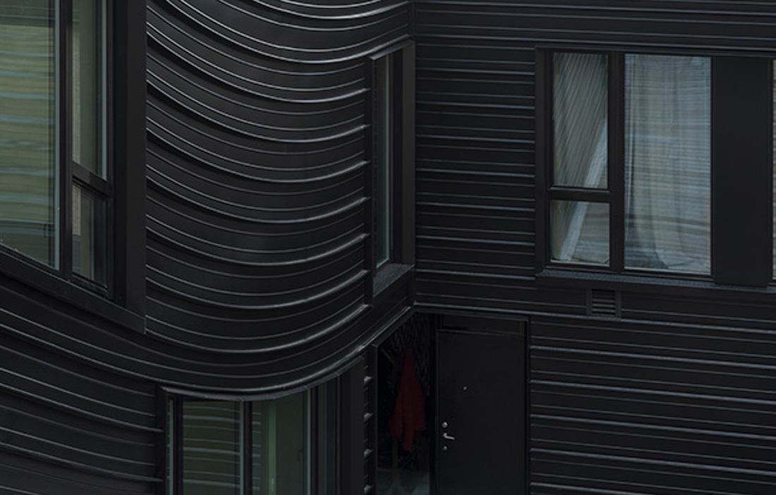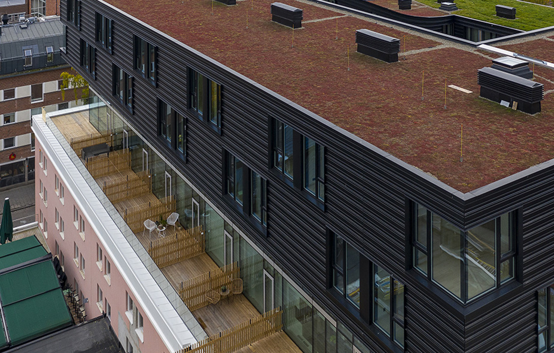 – Fasaden är gjord av svart aluminium, med spetsar av guldfärgad aluminium runt fönstren. Taket är klätt med sedum på de övre delarna för att hantera dagvattnet och med gräs på de nedre delarna som är synliga från vissa av lägenheterna, berättar Arno De Ryst.