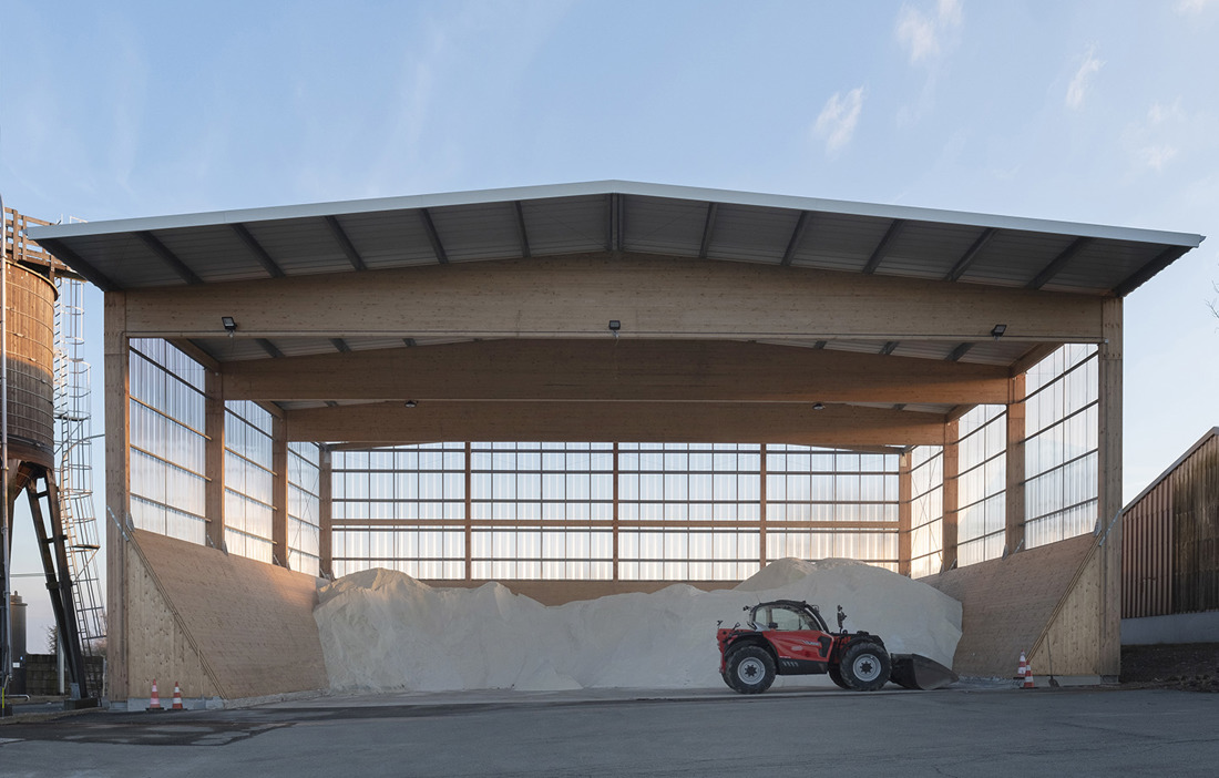 Den fjärde sidan har lämnats öppen, så att det ska vara lätt för en traktor att köra in på den 430 kvadratmeter stora ytan för att hämta och lämna saltet, allt skyddat av ett generöst taksprång.