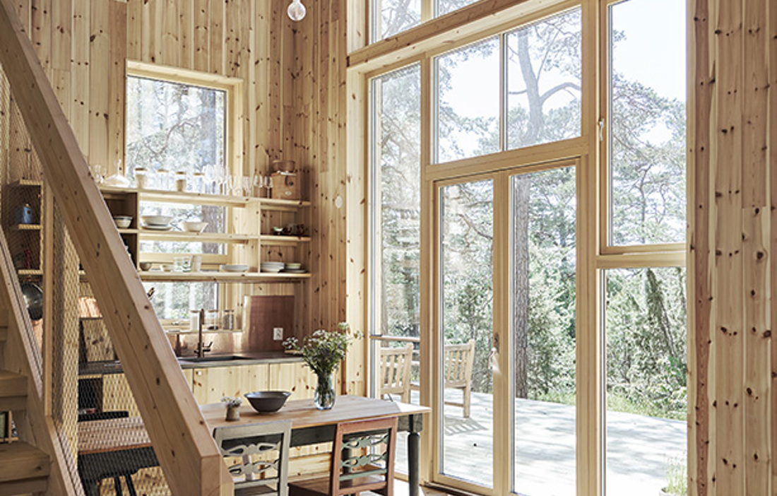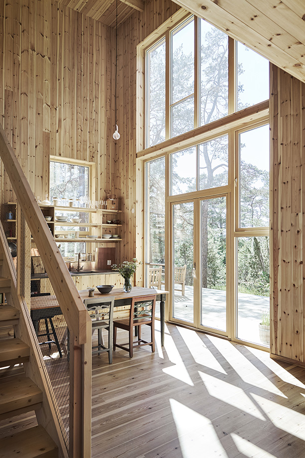 – Målet var att förstärka upplevelsen av att bo bland träden. Lisa och Joe flyttade hit från Berlin och längtade efter skog, och tallar är bra för de släpper igenom ljus. Plus att de fångar vind, säger Martina Eriksson.
