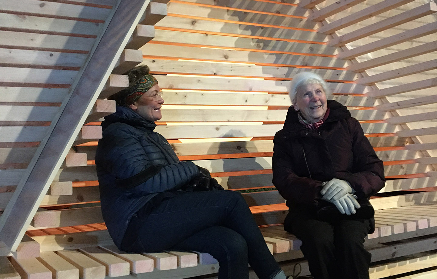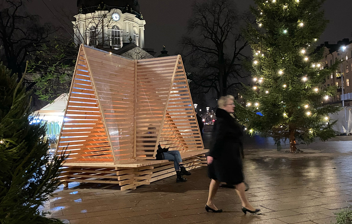 Stockholm, Sverige Under fjolåret blev social distansering det nya normala. Men samtidigt som det var viktigt att hålla fysiskt avstånd behövde människor fortfarande umgås och stävja ofrivillig ensamhet. Lagom till höstmörker och kyla fick Odenplan i Stockholm en installation som skulle ge människor hopp, glädje och möjlighet att mötas. »Vinterfamn« är formad som en lykta, lika mycket en konstinstallation som en plats för att främja välmående och gemenskap.