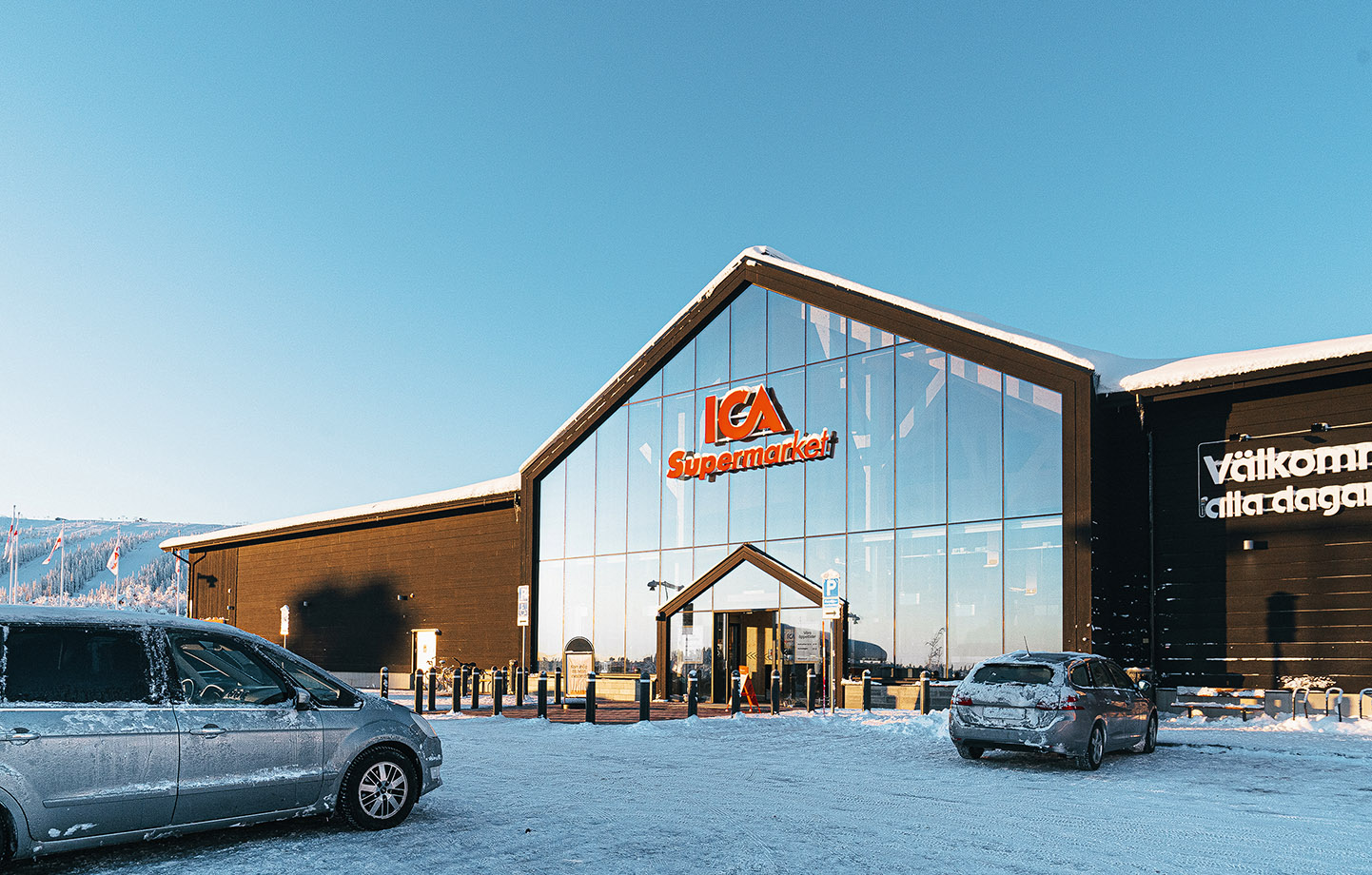 I november stod även Lindvallens nya Ica Supermarket färdig. Här har stor vikt lagts vid att låta arkitekturen spegla den lokala miljön. Ett gavelmotiv markerar entrén, och bakom ett generöst glasparti syns den exponerade träkonstruktionen. Tidigt fanns ett önskemål om en byggnad som smälter väl in i fjällmiljön, och därifrån blev klivet till trästomme naturligt.