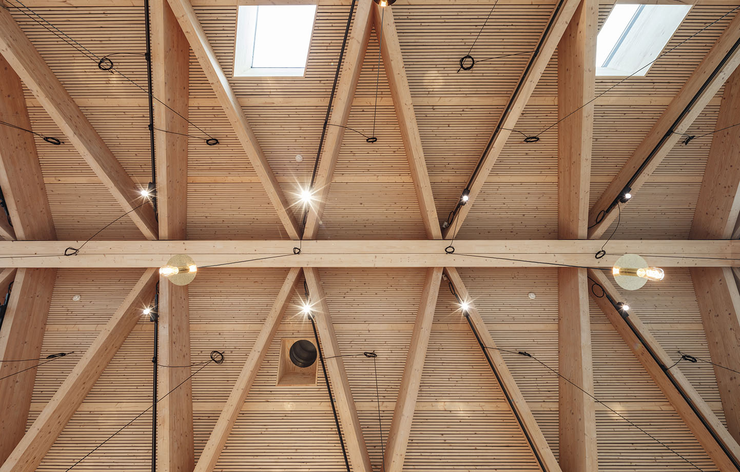 Det är ett brett rum med en fribärande konstruktion. Vi exponerar materialet – man ser hur det är byggt. Man ser träet och hur det är sammansatt, från de stora balkarna till de finare detaljerna.