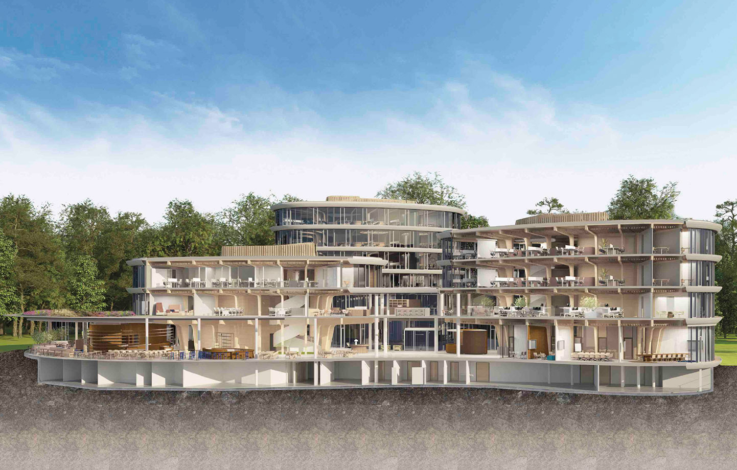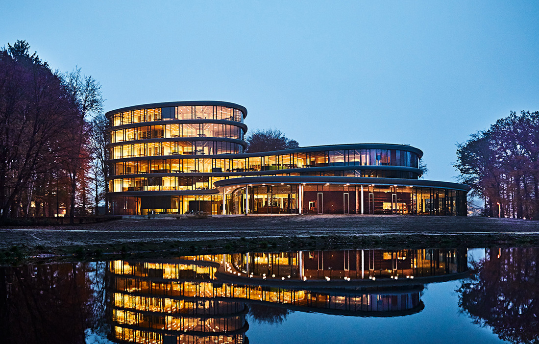 Det nya bankkontoret är vackert beläget i natursköna De Reehorst Estate i Zeist, tolv minuters tågresa från Hollands fjärde största stad Utrecht. Sett från ovan påminner byggnaden lite om en utdragen treklöver. Några meter bort tar skogen vid i en böljande rörelse som följer byggnadens form. Men det är inte skogen som fått ge vika för byggnaden, utan tvärtom.