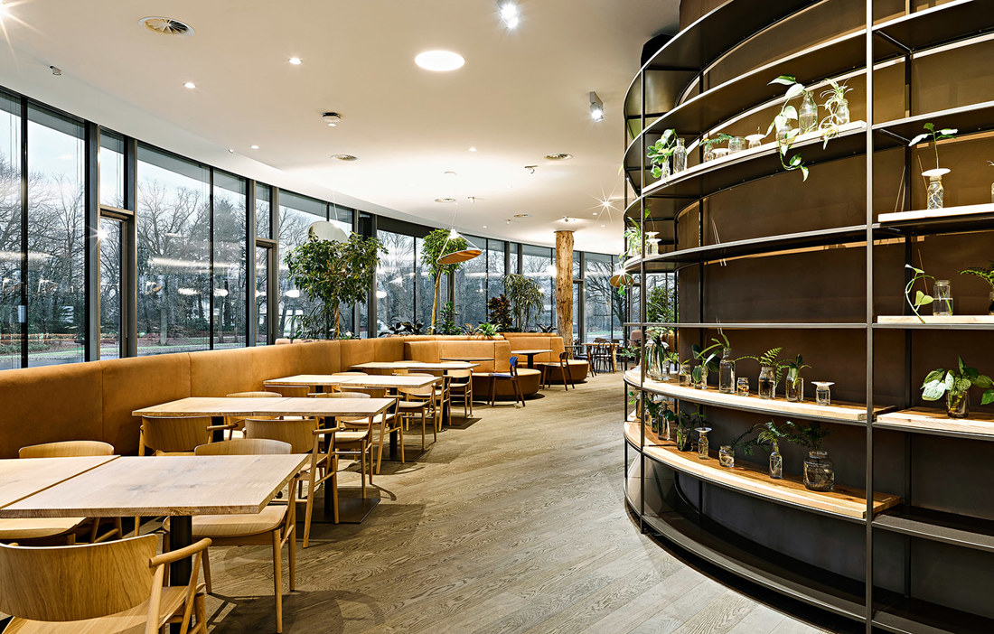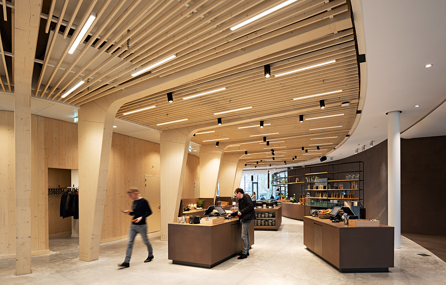 Allt som allt gick det åt 1 615 kubikmeter limträ och 1 008 kubikmeter KL-trä. I restaurangen använde man sig dessutom av fem naturliga trädstammar som fick utgöra såväl visuella som bärande element.