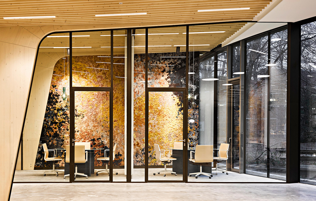 Den glasade fasaden som omsluts av naturen bjuder både på fina utblickar och rikliga dagsljusinsläpp. Men flexibiliteten är stor. Om man inte vill ha dagsljus kan man enkelt skärma av det, temperaturen kan regleras överallt och alla fönster går att öppna.
