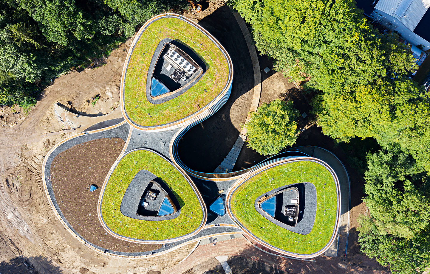 De gröna sedumtaken på tornen fyller flera funktioner. Dels bidrar de till att samla upp vatten som sedan leds vidare och används för att spola toaletterna. Dels gynnar de traktens insekter och fåglar.
