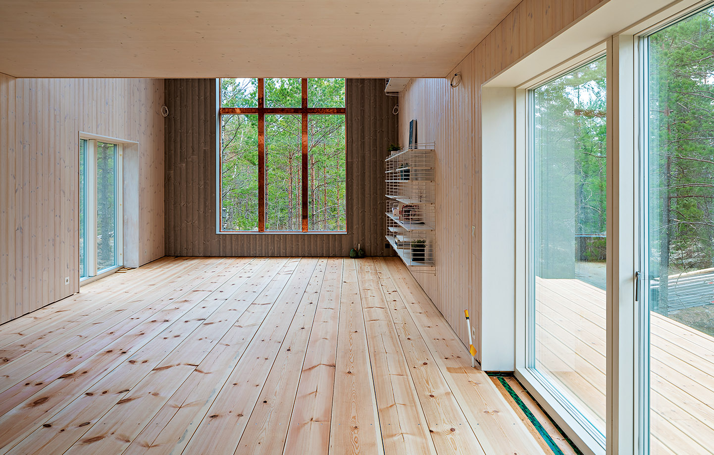 Hela huset är exteriört klätt med en elegant ramsågad granpanel i varierande bredder. De 9 360 spikar som gått åt för att få upp fasaden har Rasmus slagit i för hand för att varje spik ska sitta perfekt. På insidan sitter ett installationsskikt följt av en borstad, vitlaserad furupanel. Panelen är det genomgående interiöra ytskiktet, både för att få en ljus interiör men även för att skapa helhet.