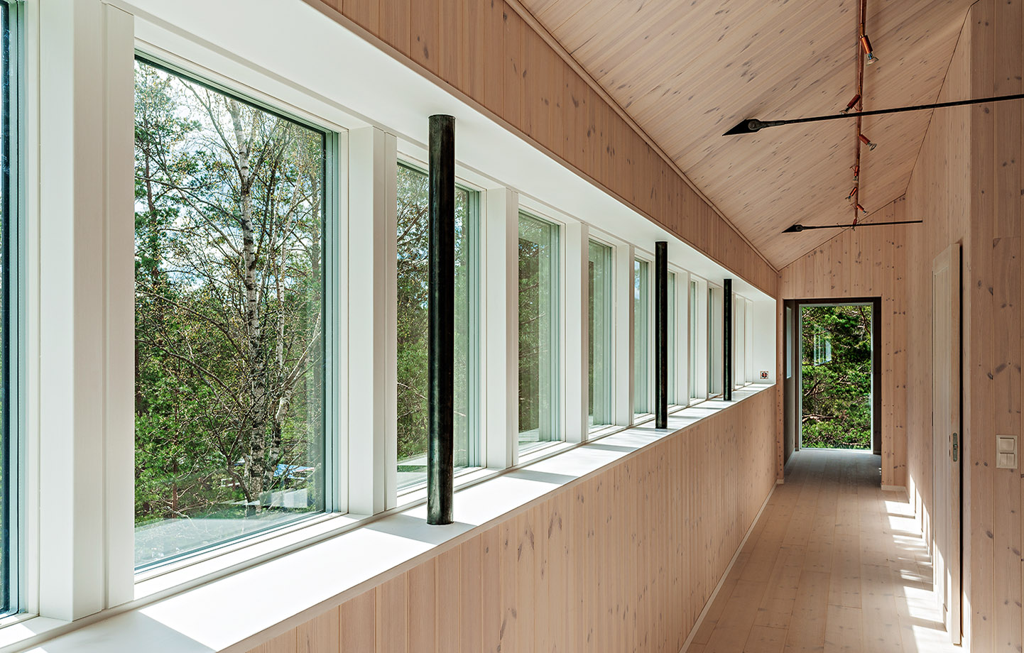 Hängrännorna är inbyggda i taket och avslutas med u-balkar i cortenstål. Det är en av många eleganta lösningar som vuxit fram under resans gång. För Rasmus Larsson har Ängsvillan, som Jonas Bohlin ritat och byggt till sig själv i Nacka, varit en stor källa till inspiration. Även här är byggnadernas form, volymer och detaljer sammanflätade med naturen, jord och himmel, ljus och topografi.