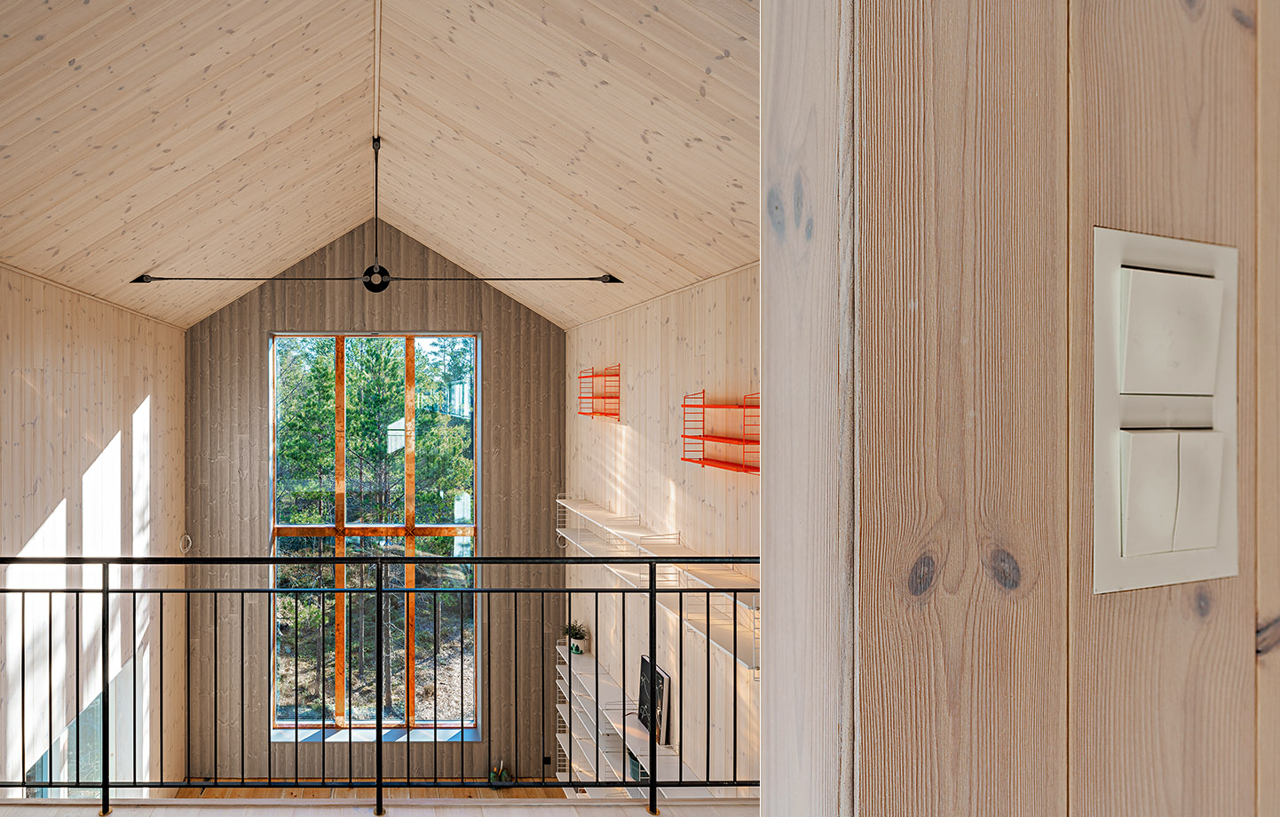 En svag doft av tjära hänger sig kvar runt Skogsvillan och kommer från fasaden som behandlats med tjärvitriol. Den varmgrå kulören fångar upp nyanserna i berg och tallstammar och gör att huset smälter in i naturen på ett självklart sätt. Även faltaket av kärnfuru, med sitt fetare och mer beständiga virke, är behandlat med tjärvitriol.