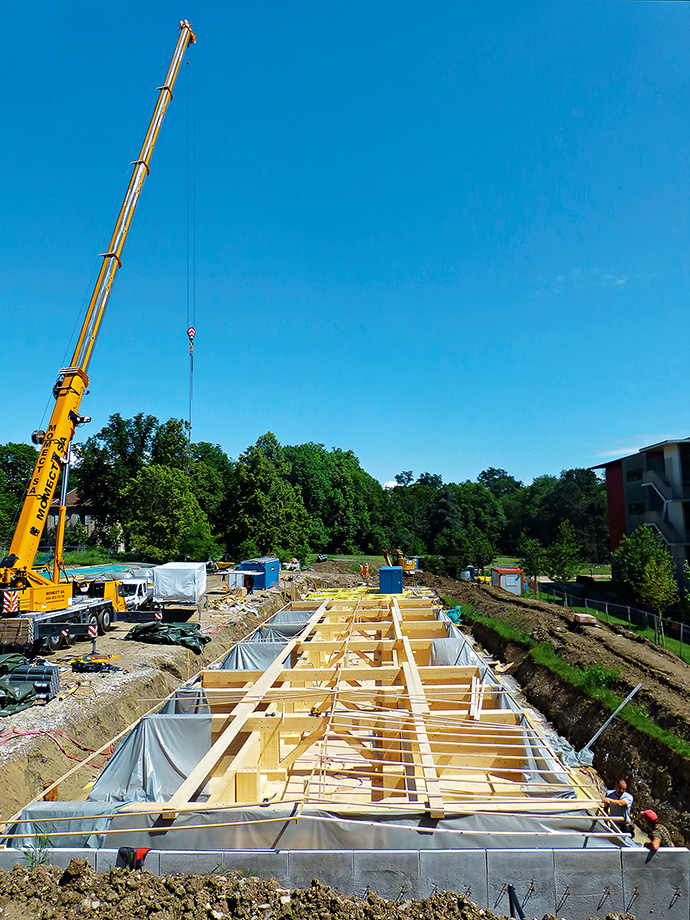 Förutom att byggnaden enkelt ska kunna monteras ner fanns ett önskemål om att minimera användningen av betong. Resultatet blev ett hus av lätt demonterbara volymelement av limträ och KL-trä, där även pålar och källarplan är av trä.
