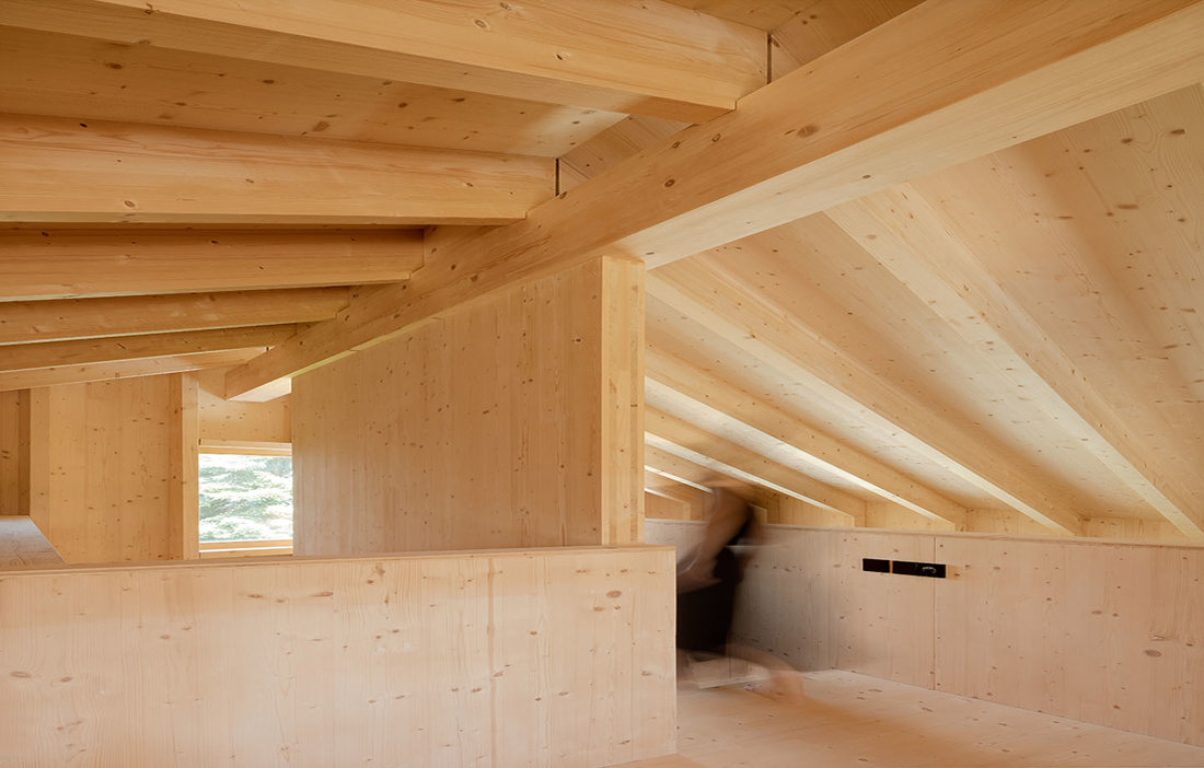 – Det är ett naturligt material som vi gärna använder när vi har möjlighet. Att vi har lämnat konstruktionen synlig i taket i stället för att klä in den är både av estetiska skäl och av hållbarhetsskäl. Det går åt mindre material, dessutom håller det priset nere. Vi har inga extra lager på vare sig ovan- eller undersidan, ingen ljudisolering, utan du går direkt på konstruktionen, säger Katja Knaus.