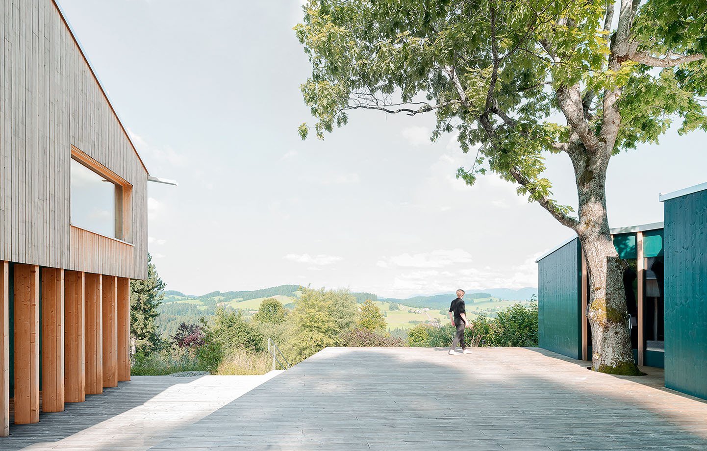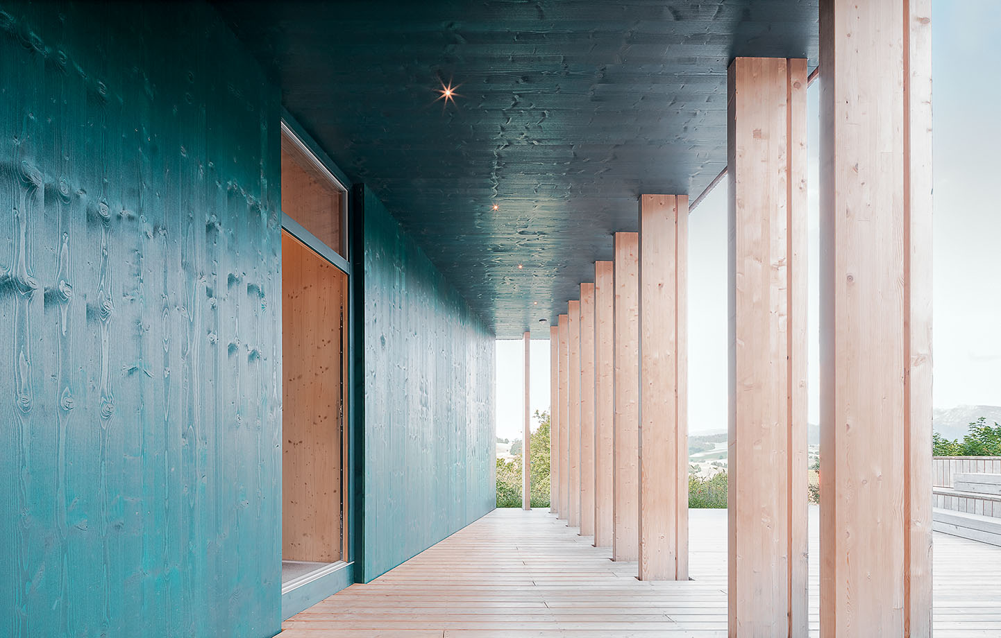 Men även om delar av konceptet ändrades bär exteriören fortfarande referenser till ett jakttorn, genom de limträpelare som ramar in bottenvåningens skogsgröna fasad och stöttar övervåningen, där panelen av europeisk gran lämnats fullt exponerad. De indragna nischerna i exteriören ger såväl skugga som mer privata utrymmen, och de har också en koppling till den mindre volym som ligger i andra änden av terrassen – där finns bastu och gästrum bakom en fasad av samma gröna färg och samma repetitiva mönster av limträpelare – vars färg och form antyder att den har skurits ut från huvudbyggnaden och placerats på lagom avskilt avstånd. Dessa detaljer skapar ett samspråk som tillsammans med trädäcket knyter ihop de två volymerna till en helhet.