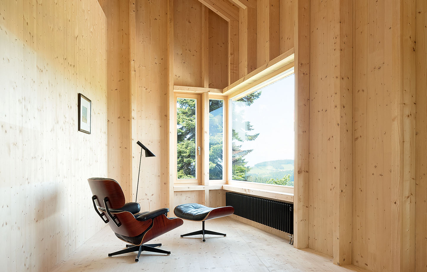 Utsikten över berg och landskap är spektakulär, men i stället för att slå upp panoramafönster och sudda ut övergången mellan ute och inne har arkitekterna resonerat tvärtom. Huset ska kännas privat och ombonat, och ett fåtal fönster har därför omsorgsfullt placerats för att lyfta fram och punktmarkera de mest speciella vyerna. Som ett fåtal inramade, levande tavlor.
