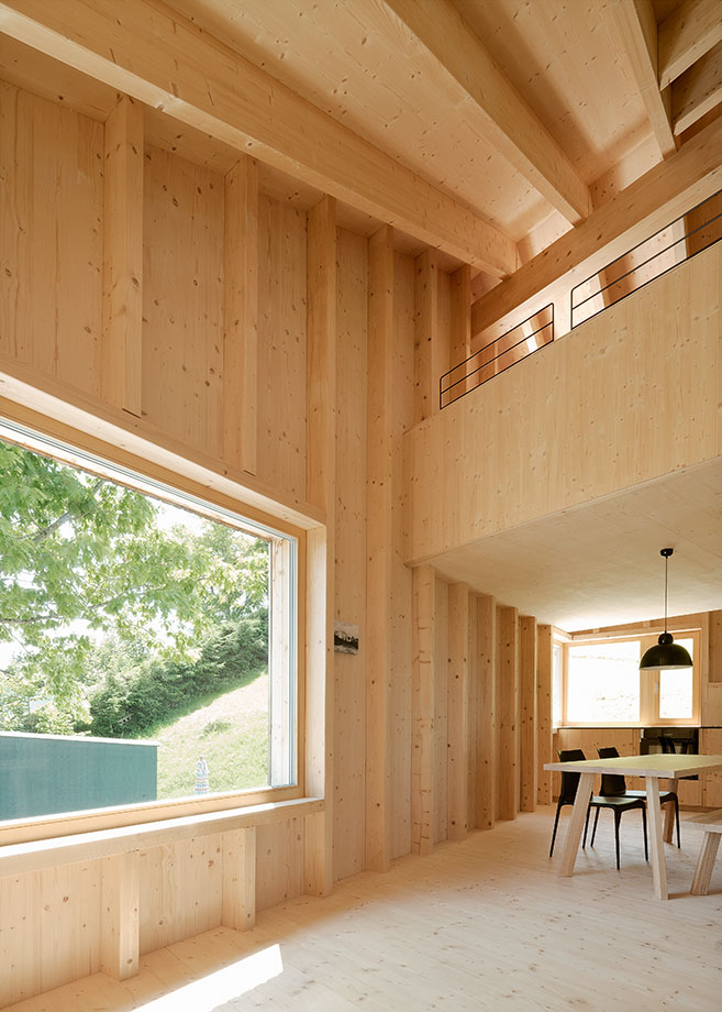 – Å ena sidan får du känslan av att vara skyddad inne i huset, vilket är viktigt eftersom det ligger ganska exponerat i byn. Å andra sidan hjälper fönstren till att lyfta fram och rama in just den utsikt som vi vill visa, säger Benedikt Bosch.