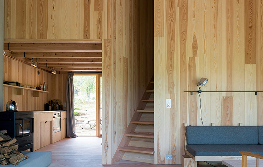 – Det är ju uppenbart att en del saker i hytten är tillbakablickande. Men sådant blir också väldigt fort romantiskt, och därför var det viktigt för mig att ge huset en sorts aggressivitet som kommer till uttryck i dragspelspanelen utvändigt och i en klar, konstruktiv enkelhet i interiören. Det måste vara lite ambivalens, säger han.