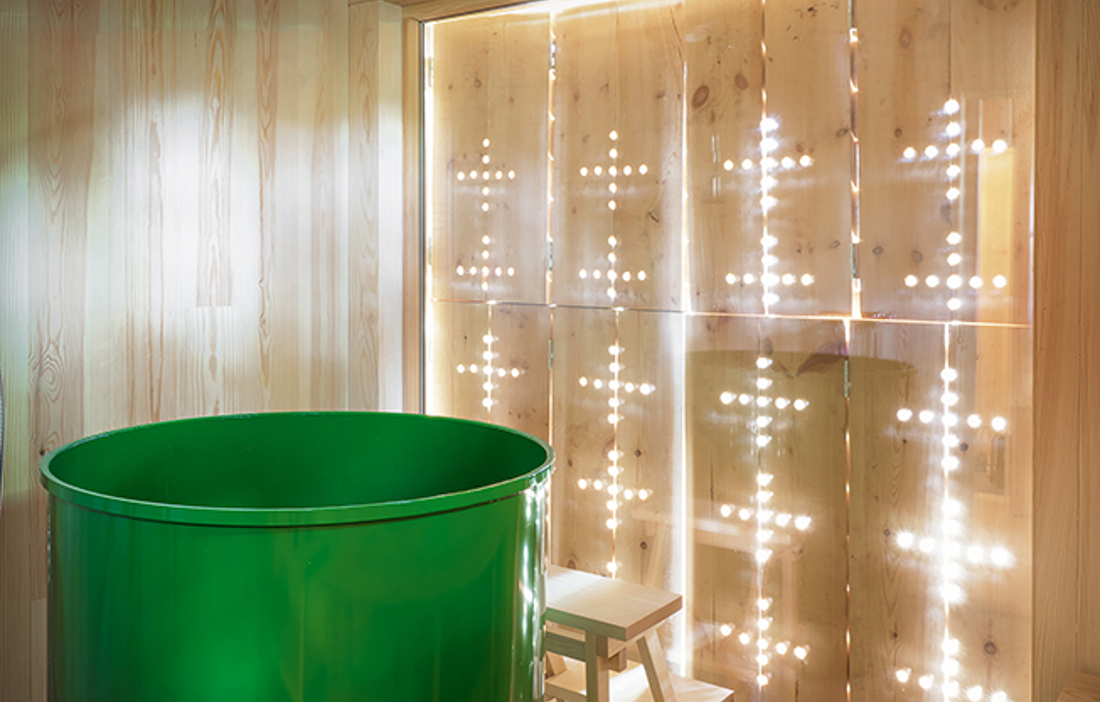 Framför badtunnan finns fönsterluckor i två nivåer. Man kan sitta i badet och titta ut genom den översta luckan. När luckorna är stängda silar ljuset in genom en perforering som i sig blir en liten skämtsam, korsformad blinkning. Materialet får inte bli för kompakt, intrycket inte för stelt, säger Knut Folstad.