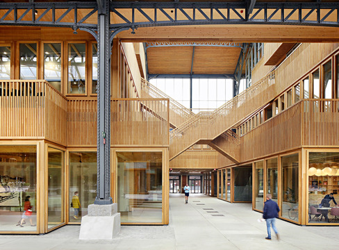 Förutom de förnyelsebara materialen har fönster och lameller av glas återanvänts från en regeringsbyggnad i Haag.