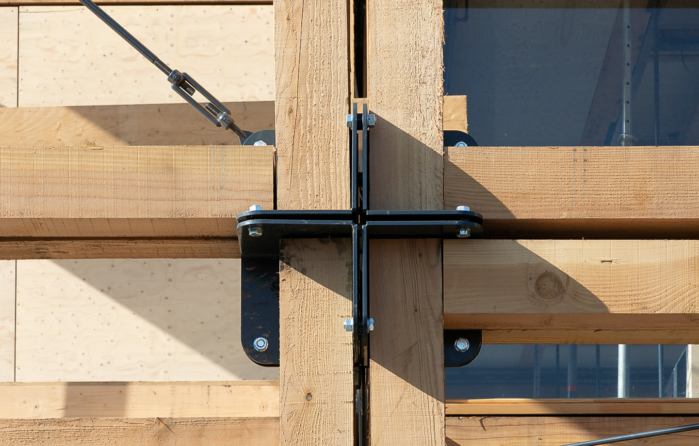 Alla delar är ihopsatta med standardiserade fogar av återvunnet stål. Varje fogdel ser ut som ett hörnskydd och i grupper om åtta bildar de tillsammans ett tredimensionellt kryss. Med hjälp av bultar och muttrar kan man sedan foga ihop alla trädelar både horisontellt och vertikalt och även addera snedgående stag för stabilitet.