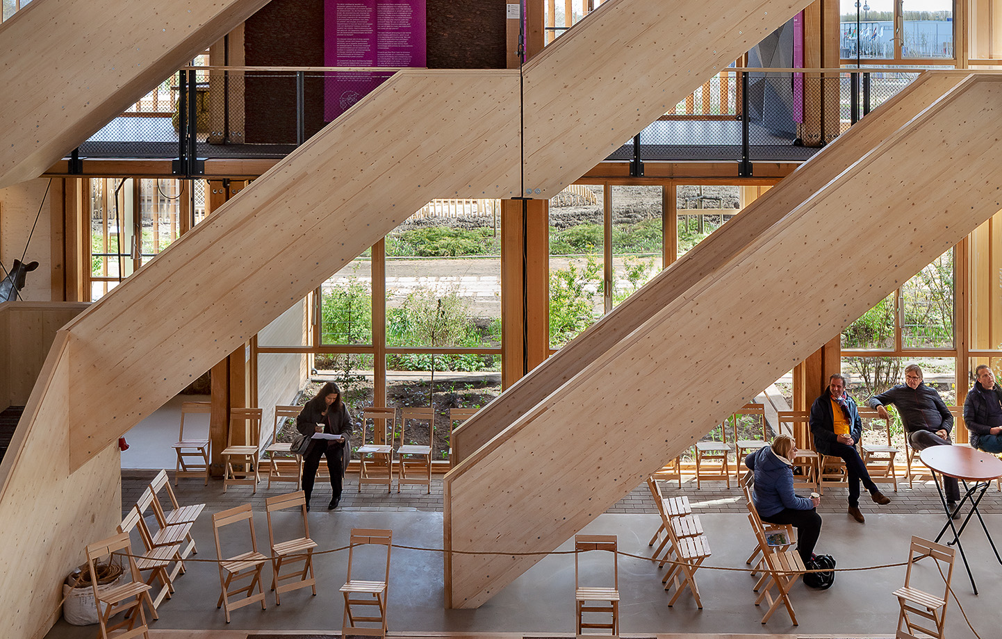 – Vi ritade, konstruerade och uppförde byggnaden inom loppet av nio månader, så träet hade inte möjlighet att torka normalt. Det fortsatte att torka under tiden som byggnaden var uppförd. Vi tillät därför ett flexibelt utrymme i fogarna så att träet kunde krympa. Tack vare träelementen och fogarna fick vi en lätt konstruktion som dessutom är demonterbar, berättar Richelle de Jong.