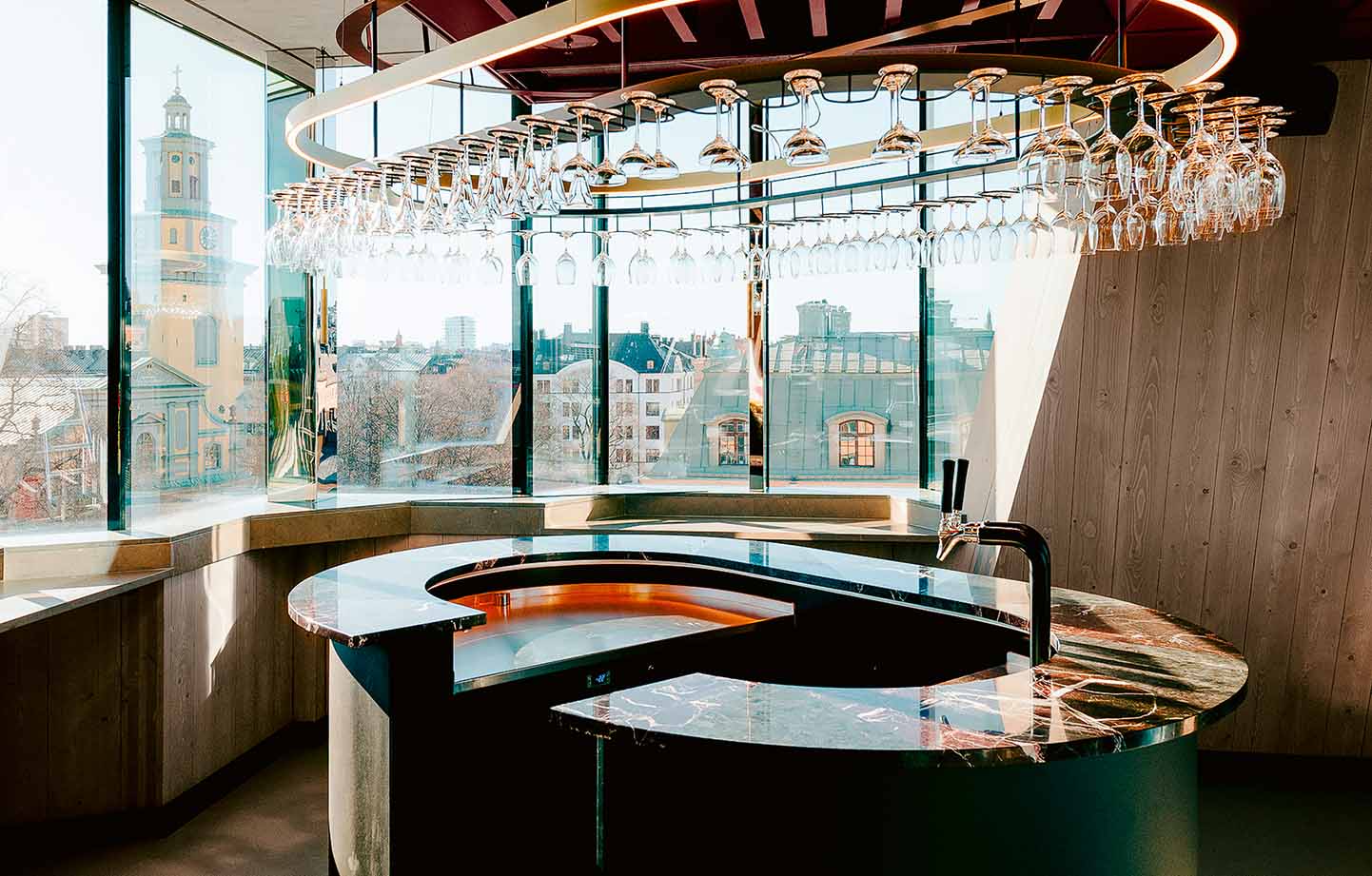 – Trä går hand i hand med det koncept och den filosofi vi har för Freyja. Här jobbar vi nordiskt, vilket speglar allt från det vi lägger på tallriken till miljön vi rör oss i. Materialet ger takvåningen en varm och ombonad atmosfär. Dessutom bidrar det till en riktigt bra akustik som uppskattas både av våra gäster och av oss som arbetar i restaurangen, säger Malin Olander, vd för Freyja.