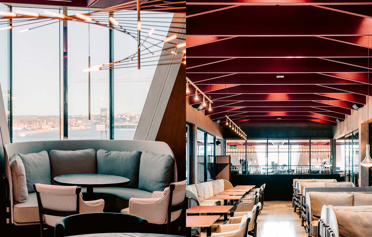 Den nya glaslanterninen vilar som en uppochnedvänd båt diagonalt över det nya våningsplanet där påbyggnaden ansluter till den utökade höjden på ena sidan om lanterninen. Ena halvan utgörs av restaurangdelen under tak och den andra av terrassen under bar himmel med plats för 400 gäster. Att besöka restaurangen känns som att kliva in i en vindsvåning där intrycket förstärks av fina utblickar i alla väderstreck tack vare de påbyggda burspråken. Alla installationer är gjorda direkt mot den synliga trästrukturen med tillägg av bordeauxfärgade akustikelement framtagna av Wingårdhs Göteborgskontor som ansvarat för inredningen.
