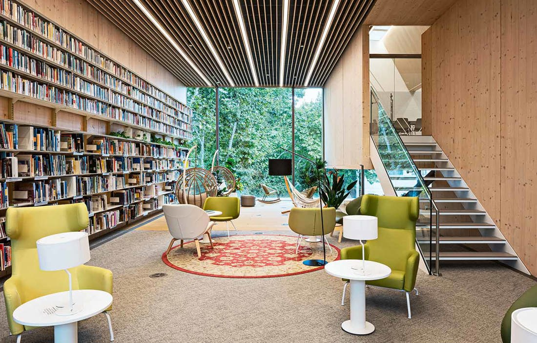 – Den öppna trappan inbjuder dig att gå igenom biblioteket och betrakta det som ett slags landskap eftersom rummen också förändras från ett hörn till ett annat. Lättheten i strukturen, ljuset som går i flera riktningar och öppenheten genom fönstren mot träden på gatan gör det varmt och välkomnande, och det är som om besökarna vet precis i vilken riktning de ska gå, säger Guillermo Sevillan.