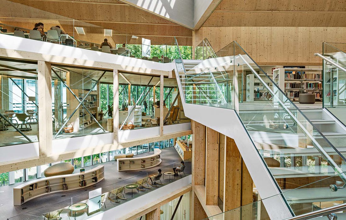 Medan fasaden, vid sidan om böckerna, är klädd med ett hybridmaterial, en blandning av lim och träfiber som är vädertåligt och kräver minimalt med underhåll, är interiörens KL-trä och limträ tydligt exponerat i interiören. Endast behandlat mot brand och missfärgning av solljus. De kompletterande förstärkningarna av stål är dolda, som ett skåpsystem, för att ge ett sammanhållet uttryck där ögat ska luras att se bara delar av konstruktionen som är gjord som ett tredimensionellt system, där de olika materialen samspelar.