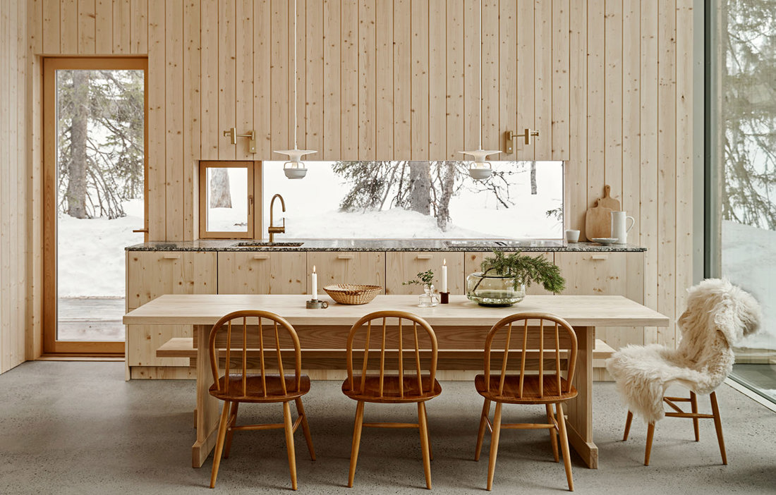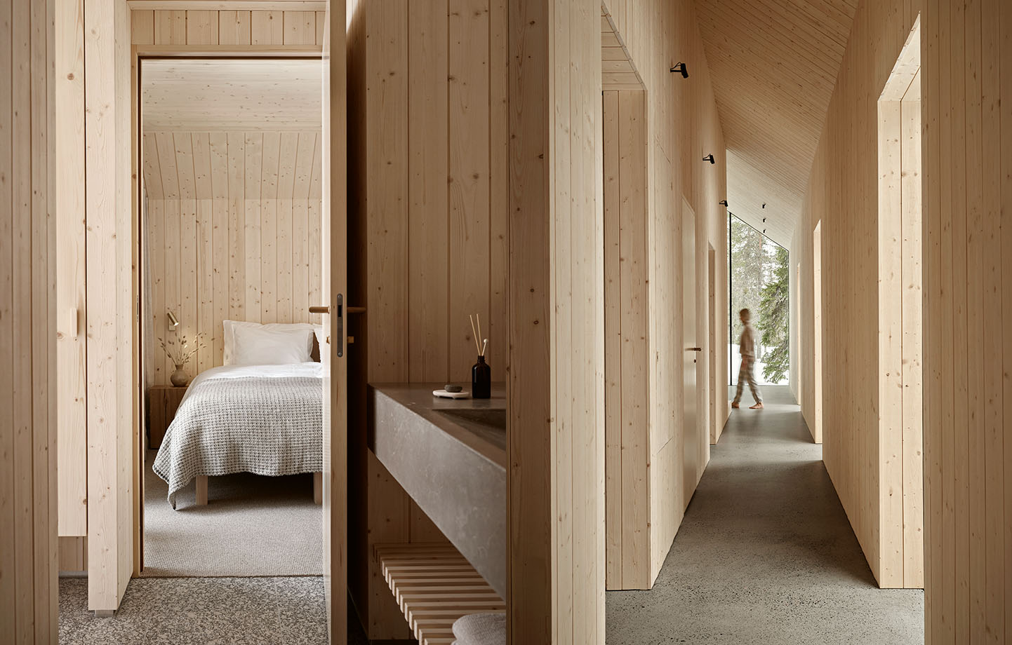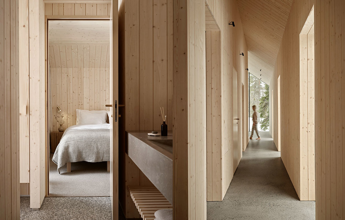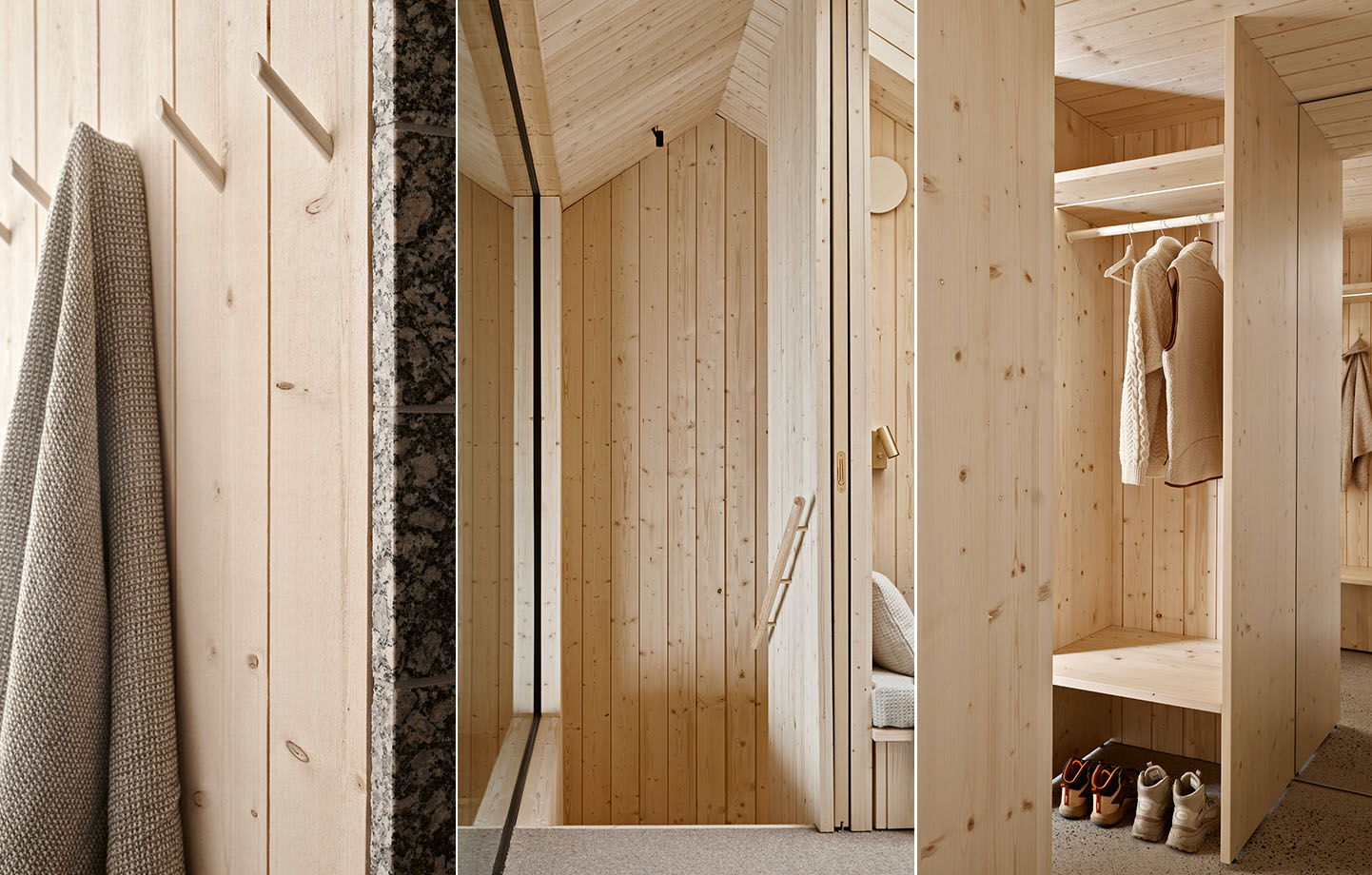 Men det är också sådana detaljer som ger det råa träet en genomtänkt elegans. I hallen finns platsbyggda hyllor och krokar för att familjen lätt ska kunna ställa in sin fritidsutrustning – en viktig funktion som i hög grad har påverkat interiörens uttryck. I skidorten Äkäslompolo i finska Lappland är det framför allt naturen och olika uteaktiviteter som lockar. Familjen har två stora intressen: utförsåkning och mountainbike. Det har präglat kopplingen mellan rummen och hur deras olika funktioner är fördelade. Stora förvaringsutrymmen redan i entrén, tillsammans med en strategiskt placerad tvättmaskin, gör att familjen kan lämna lera och smuts där när de kommer in efter en cykeltur. Innanför entrén finns badrum med bastu samt generösa garderober, allt placerat som små öar, med passager på flera sidor för att få ett bra flöde i huset.